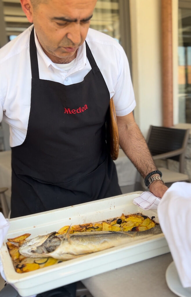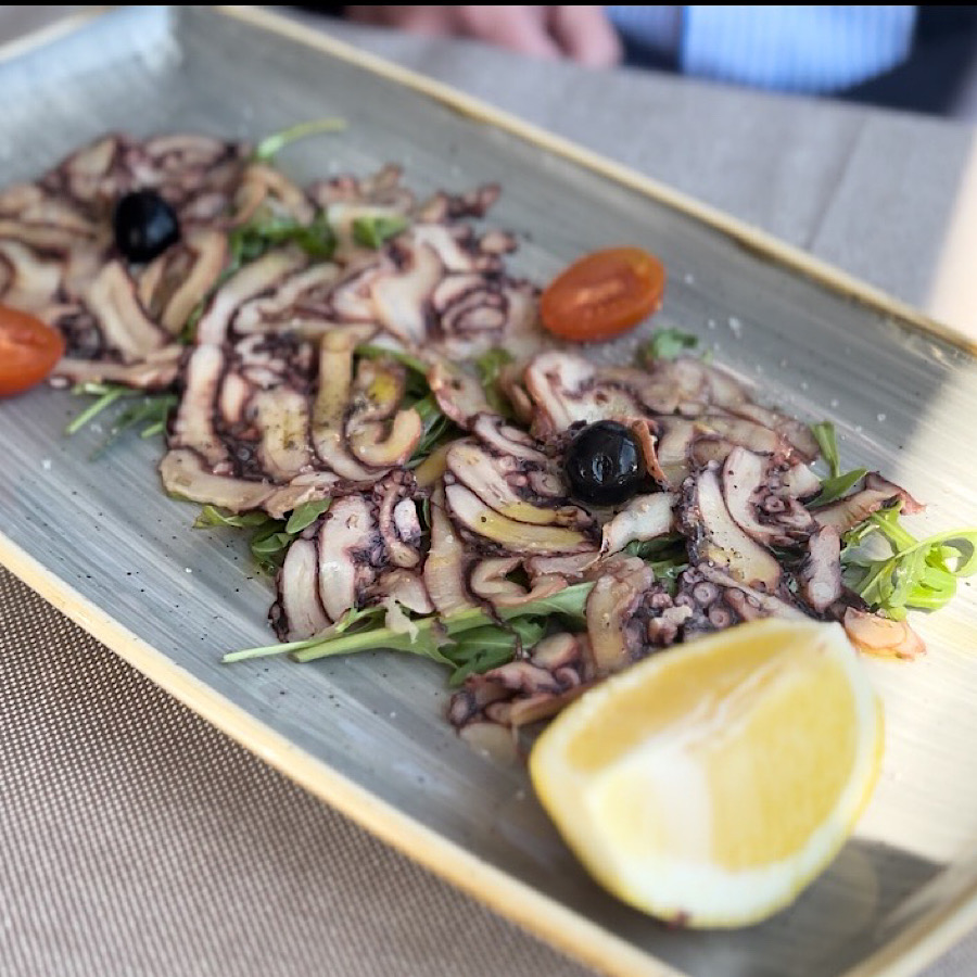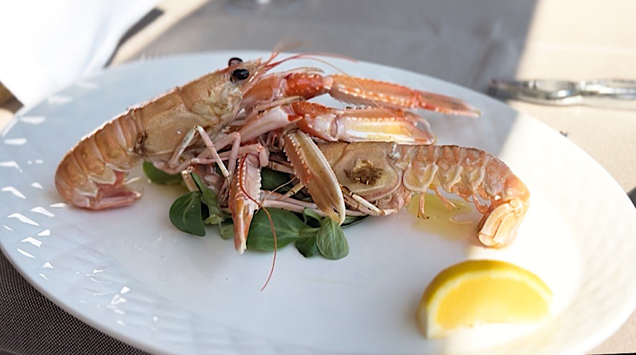 Među predjelima ističu se jedino carpaccio od škampa, tagliata od hobotnice i kaneštrele na pari. Nema rakovica ni kamenica, a nigdje se ne spominju šparoge, što je neobično za Istru u travnju. Obeshrabreni izostankom riblje vitrine i dosadnim jelovnikom, od jučerašnjeg ručka nismo očekivali mnogo. Ljubaznog smo konobara rutinski pitali što je najsvježije. Čovjek nam je preporučio žive škampe, većeg brancina i manje rombove.