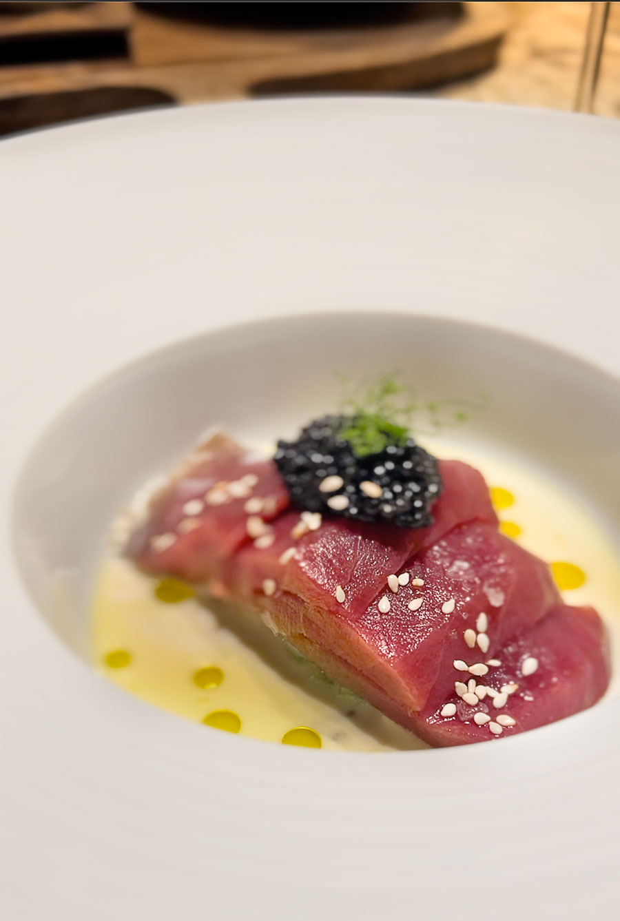 Dapače, izvrsni sashimi od plave tune dobio je luksuznu notu zahvaljujući većoj žlici kavijara. Carpaccio od škotskog angusa bio je, hvala bogu, serviran na sobnoj temperaturi i rezan puno deblje nego što se to inače radi u Hrvatskoj.