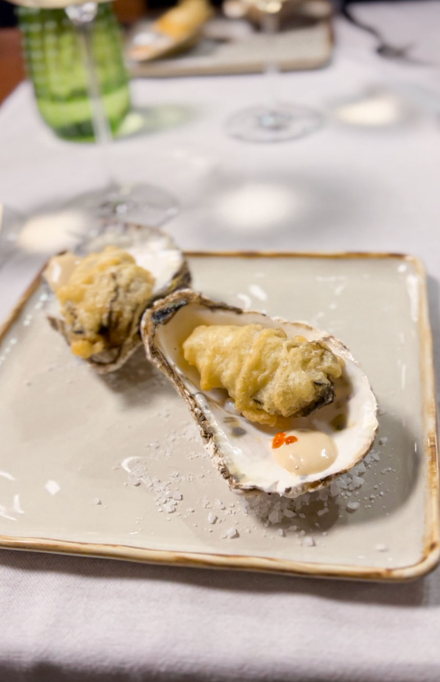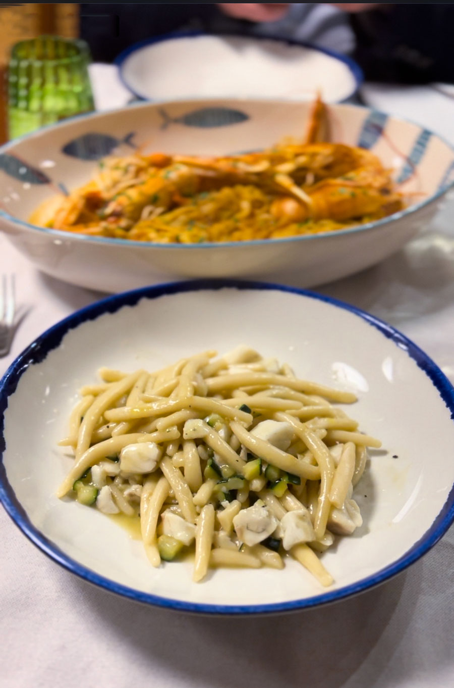 Naručili smo, naravno, buzaru od škampa s tagliatellama, koja je bila jednako ukusna kao u 80-tima; škampi su bili jako veliki, čvrsti i slatki. Prije škampa i pljukanaca s finim, sirovim brancinom koji se tek malo skuhao na toplini tjestenine, probali smo izvrsne debele kamenice u tempuri, s majonezom sa sojinim umakom, i još bolje rezance od sirovih lignji.