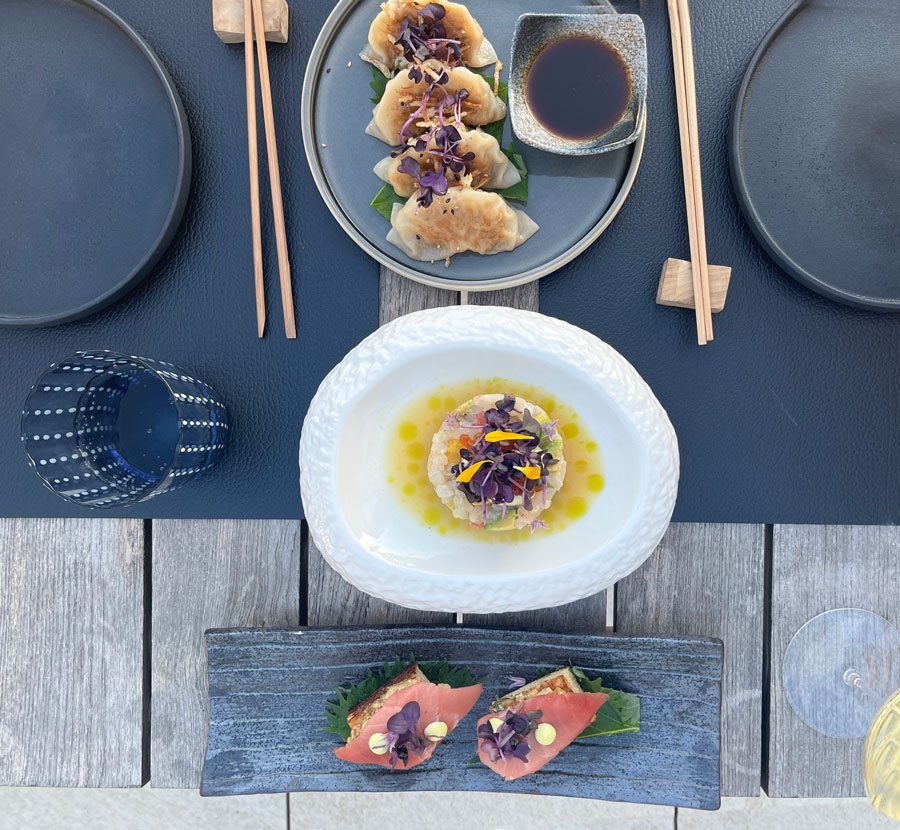 Gyoze punjene piletinom i kozicama, izvrsno kombinirane s ljutim umakom i prženim mladim lukom, ostavile su najbolji dojam. Tuna na francuskom kruhu i foie gras bile su korektne ali ni blizu gyozama. Jelo je djelomično kreativno, no u drugu ruku i pomalo generično.