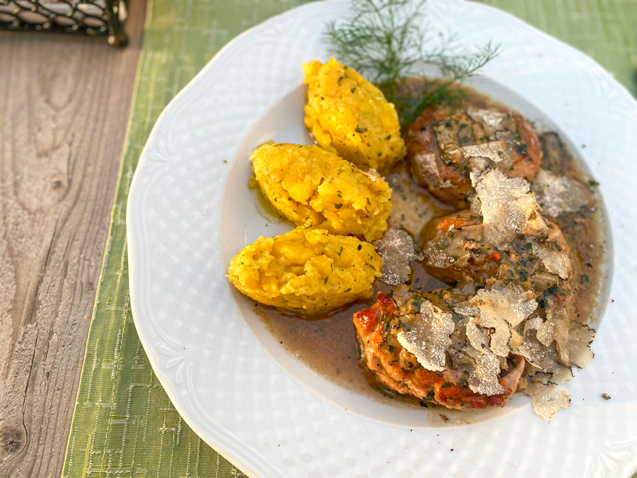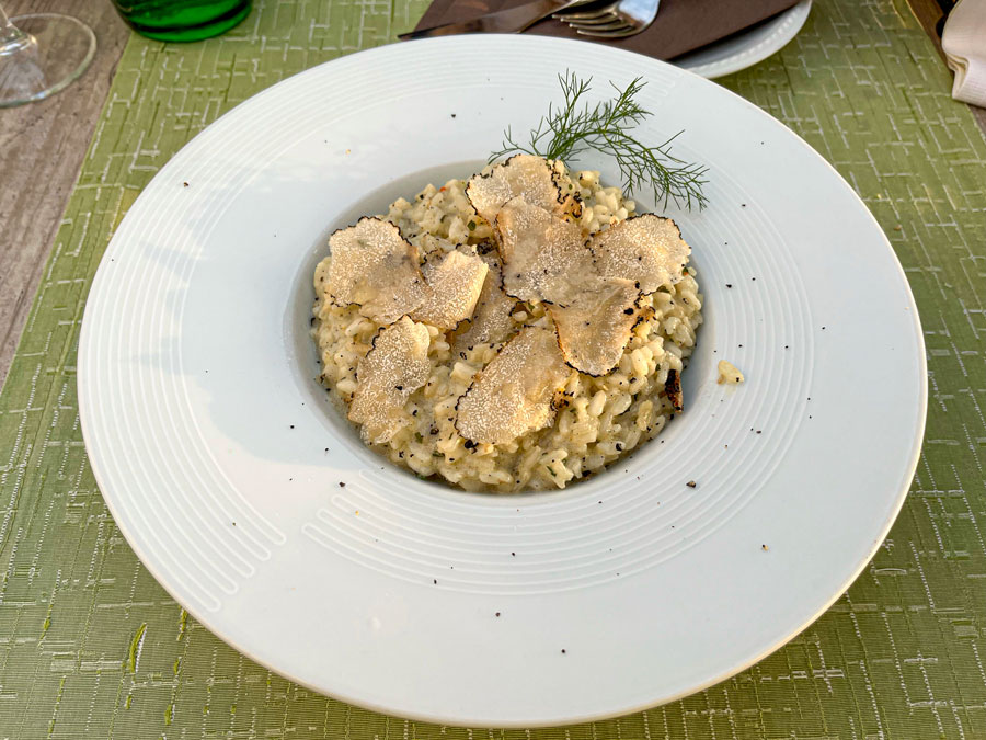 Jelovnik je uzoran, ili makar bolje koncipiran od većine, ali ne predstavlja ništa što se ne bi moglo vidjeti i kod nizu sličnih lokala. Red pršuta, red sira, pa tjestenina, rižoto, bifteci i poneki sigurnjak poput pilećih prsa. Mi smo, smješteni za fantastičan stol, prvo naručili ovčji sir, koji je bio tek korektan, i carpaccio koji je bio znatno bolji, rađen školska, serviran na sobnoj temperaturi, blago začinjen i vrlo dobre kvalitete. Carpaccio je bio oplemenjen je i sasvim solidnim tartufima. Prilično je žalosno što nam nitko nije poslužio bilo kakvo maslinovo ulje u najboljoj regiji maslinovih ulja na svijetu.