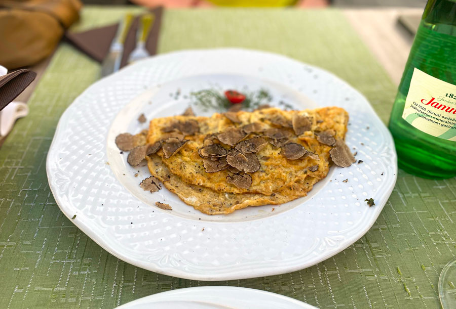 Isto tako je žalosno što Pod Voltom maltretira goste kupovnim kruhom, koji nije bolji od lošeg kruha iz kvartovskog supermarketa. Iz znatiželje smo htjeli vidjeti kako kuhinja radi omlet s tartufima. Dobili smo neobično precizno pečen omlet, prilično velike porcije, s kojima doručak na takvoj lokaciji u Motovunu jednostavno mora biti magičan. Opet je šteta što uz omlet dobijete katastrofalan kupovni kruh.