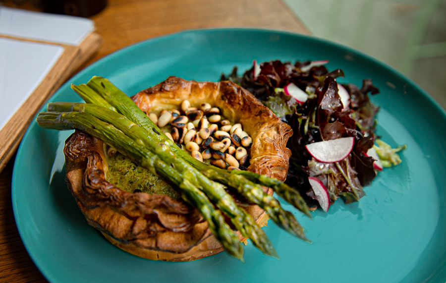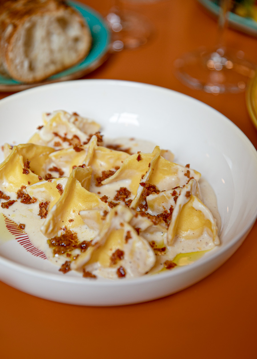 Novi je meni pun visokokomercijalnih, dobro koncipiranih jela poput quichea sa šparogama i pinjolima, i prilično neodoljive inside-out carbonare. Inside out carbonara znači da se umak za carbonaru nalazi u trokutastim raviolima, posutima crumbleom od guancialea. Tjestenina ima jako kompleksnu, hrapavo meku teksturu. Vegetarijanci mogu ručati salatu od zelenih šparoga s humusom, malim rajčicama i grana padanom, a carnivori glazirana svinjska rebra s izvrsnim “crnim” ljutikana, salatom od komorača i biskvitom.