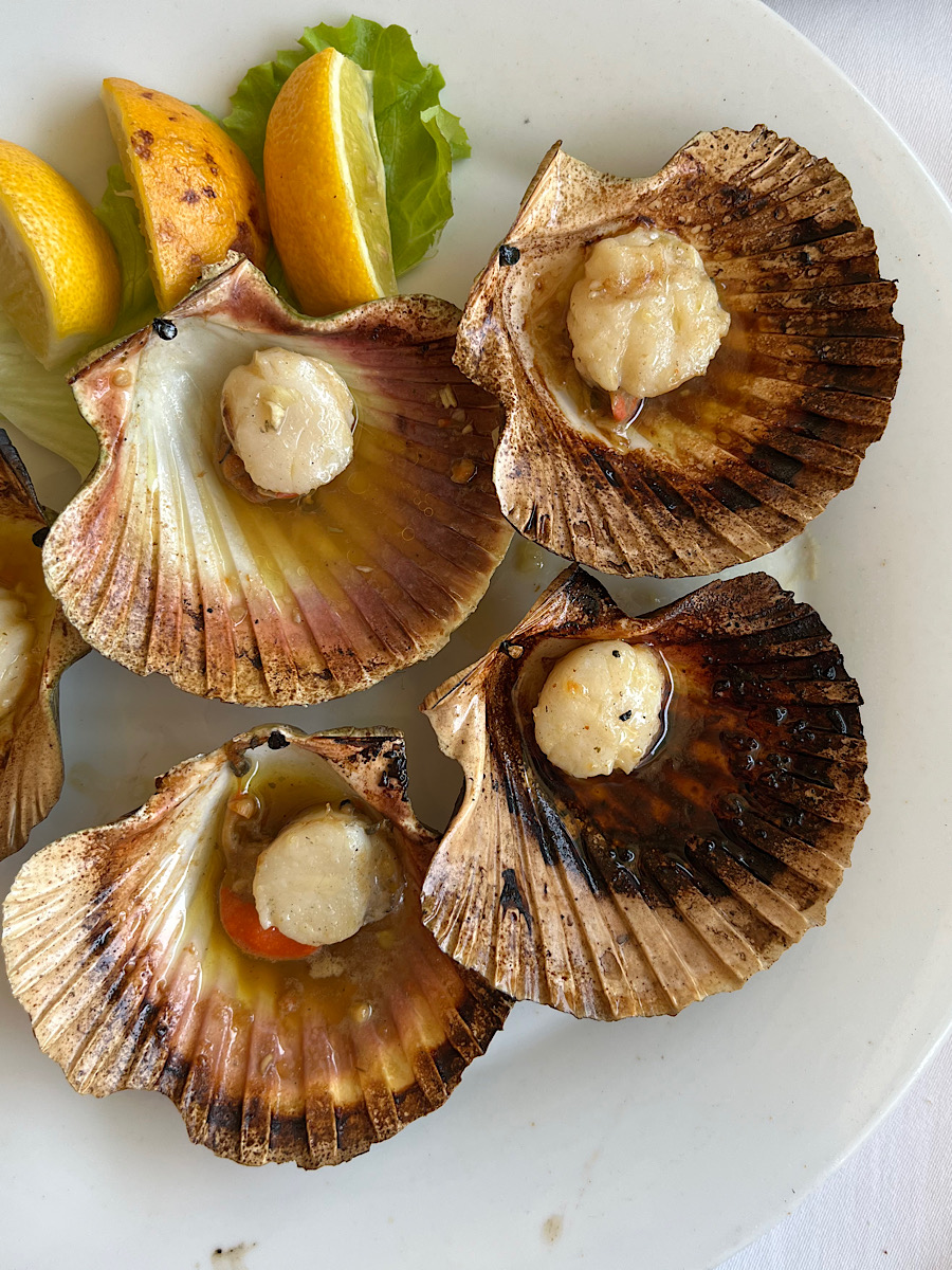 Fascinirani ljepotom i svježinom ove vrijedne namirnice odlučili smo da glavno jelo bude buzara, a u međuslijedu smo narucili pečene kapesante. Divne školjke došle su sa starinskim umakom maslinovog ulja, konjaka i češnjaka koji, pohvalno, nije preuzeo cijelo jelo.