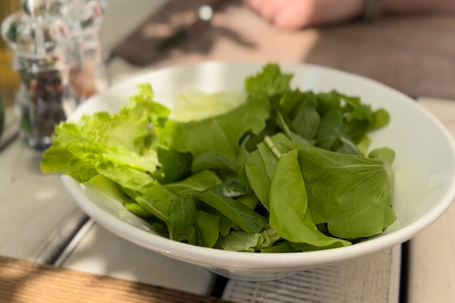 U zdjeli salate bili su pomiješani savršeno svježi  listovi  rikule, salatine i zelenog radiča. Svaki je list bio savršen, prštao klorofilom i bogatim zeleno  paprenim okusima. Salata je bila toliko fina  da smo prvu zdjelu pojeli za tri minute, između predjela i ribe, pa smo odmah naručili još jednu.