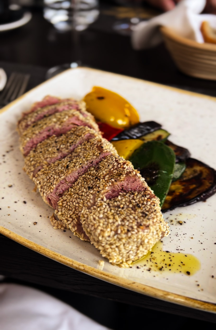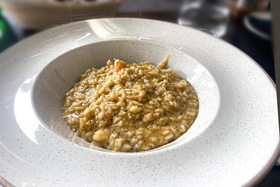 Rižoto sa škampima bio je propisno kuhan, s al dente rižom, kremaste teksture i s obiljem mesa škampa. Rižoto se kuha prema klasičnoj proceduri i spada među bolje u Zagrebu. Carpaccio od tune lijepo izgleda i prilično je ukusan, dok je tunin file u sezamu bio precizno pečen. Kruh je sasvim solidan: u Istri bi briljirao.