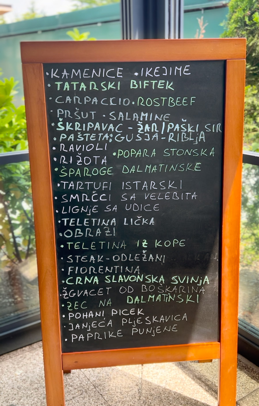 Pogled na Tačovu crnu ploču demonstrira kako treba izgledati restoran sezonske nacionalne kuhinje u ovo doba godine. Tu su još uvijek divlje šparoge, slatko gorke, još uvijek smrčci, oni zadnji, još uvijek kamenice, puno crnih tartufa, fenomenalni fažoleti… Danas nije bilo paski, graška i boba. Doći će sutra, pa će se ploča promijeniti. Tu je i niz lokalnih proizvoda poput ličke teletine, kao i spektakularna vitrina s jadranskim divljim ribama.