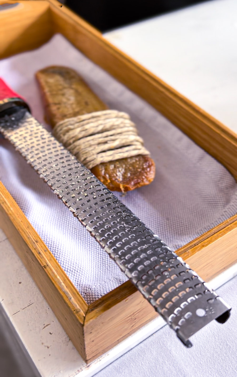 Rezultat je vrlo snažno, pomalo radikalno jelo prepuno jodiranih, koncentriranih ribljih okusa, koje pleše na rubu između fine dininga i comfort fooda i koje je toliko ukusno da vrijedi tri sata vožnje od Zagreba do Murtera. Idući primjer sofisticiranog i promišljenog pristupa lokalnim sastojcima jest prezentacija nekoliko rezova plave tune. Prvo, normalno je da se restoran u srednjoj Dalmaciji fokusira i na plavu tunu, jer tuna koja se uzgaja u tom dijelu Jadrana zaista spada među bolje na svijetu.