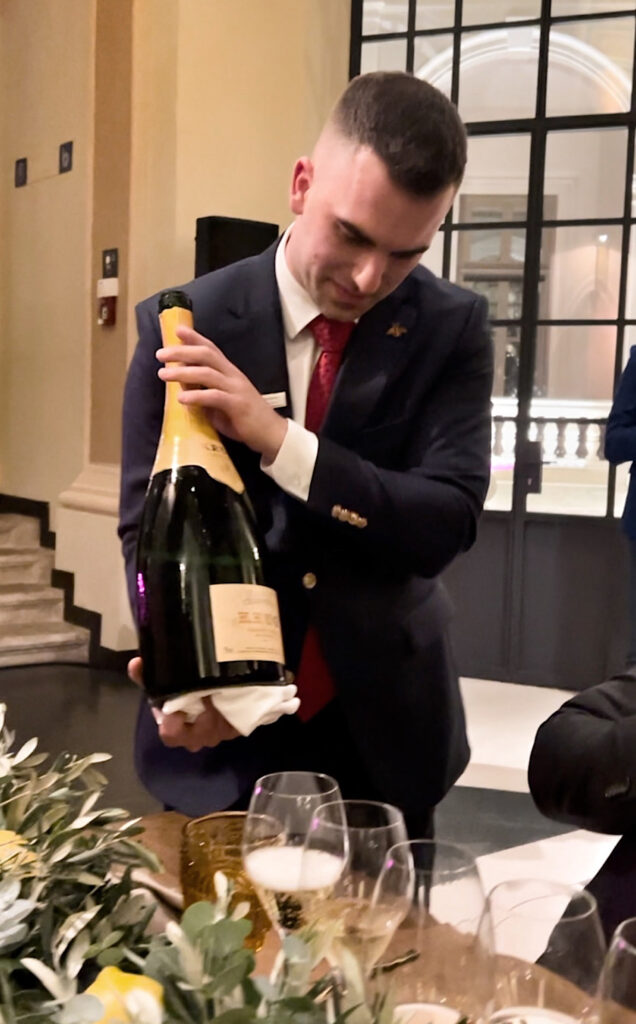 Gala večera u Botaniqu počela je aperitivom u jednom od hotelskih salona, gdje se iz magnuma točio Grande Cuvee. U restoranu je uz prvo jelo, poširanu pastrvu s kavijarom i crnim limunom, poslužen još mladi, vibrantni Grande Cuvee iz 170. izdanja, baziranog na berbi 2014.