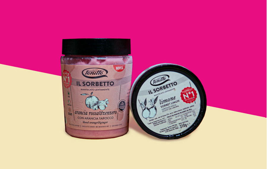 Još jedan proizvod koji karakterom ne spada u frižidere u supermarketima. Tonittov Sorbetto proglašen je najboljim proizvodom u Italiji u svojoj kategoriji. Rade ga od Tarocca, sorte crvene naranče iz Sirakuze. Tarocco zapravo nisu crvene već imaju narančastu boju i prošarane su crvenim točkama koje podsjećaju na kapi krvi. Nemaju sjemenke, vrlo su slatke, aromatične i imaju umjerenu gorčinu za razliku od nekih drugih sorti crvenih naranči. U Tonitto Sorbetu uspjeli su sačuvati zaista puno okusa naranče (ima je 40 posto) uključujući osvježavajuću gorčinu na aftertasteu, i sve su naglasili đumbirom koji daje reskost, cvjetni element i ostavlja čisto nepce s malo ljutine. Teško je zamisliti bolji hladni desert na +40.