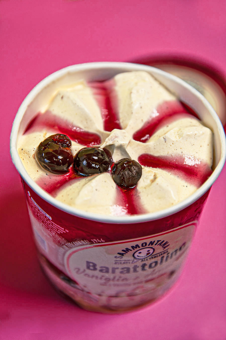 Teško je reći što je u ovom sladoledu iz toskanske Sammontane, institucije talijanske industrije sladoleda, nostalgičnije. Starinski dizajn kartonske kantice, njena veličina ili cijele Fabbri amarene koje vas gledaju kad podignete poklopac. Tamne točkice u sladoledu ukazuju da za sladoled koriste i nešto prave vanilije (to je navedeno i na deklaraciji) ali većina je ipak ekstrakt što ne smeta, jer onaj tamni okus ekstrakta koji malo podsjeća na polituru odlično ide uz amarene i sirup od griotta s kojim je sladoled štedljivo preliven. Sve u svemu, jedan jako lijepi klasični industrijski sladoled više srednje klase, sa stručno izvedenom, laganom kremastom teksturom gelata i iznenađujuće prirodnim mliječnim okusom bez previše slatkoće. Višak šećera se osjeti se na aftertasteu, ali srećom bez masnoće. Idealno za čašicu maraskina uz sladoled.