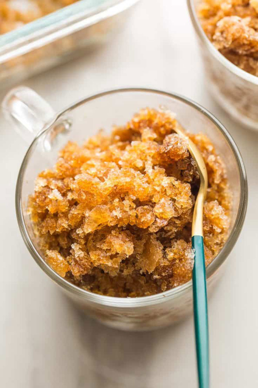 Nakon 45 minuta u zamrzivaču provjerite kavu. Na rubovima bi se trebala početi smrzavati a u sredini još biti tekuća. Vilicom dobro promiješajte da se kristalići leda pomiješaju s tekućinom. Ponavljajte svakih pola sata dok ne dobijete željenu konzistenciju i teksturu. Trebat će otprilike dva sata.