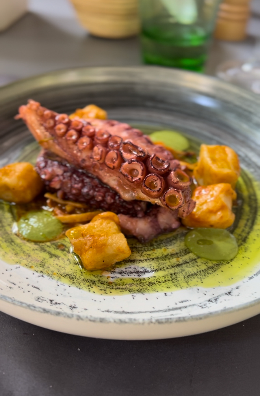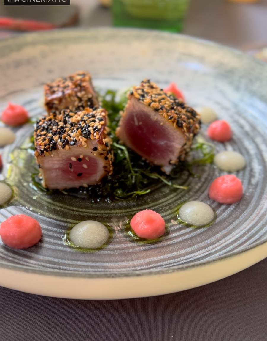 Tataki od plave tune s Ugljana, narezan na debele kocke i poslužen s hladnim pjenicana od jabuka i đumbira, bio je fenomenalan. Doslovno neusporedivo ukusniji nego u 99 posto hrvatskih azijskih restorana. Velik krakovi hobotnice kuhani u garam masali redefiniraju uobičajene hrvatske predodžbe o poželjnim okusima hobotnice, dok je sočni file šanpjera serviran s kremom od mladog graška i žestokim Kumparičkinim kozjim sirom rastpljenim brenerom najradikalnije jelo na Balonovu meniju. I jedno od najboljih.