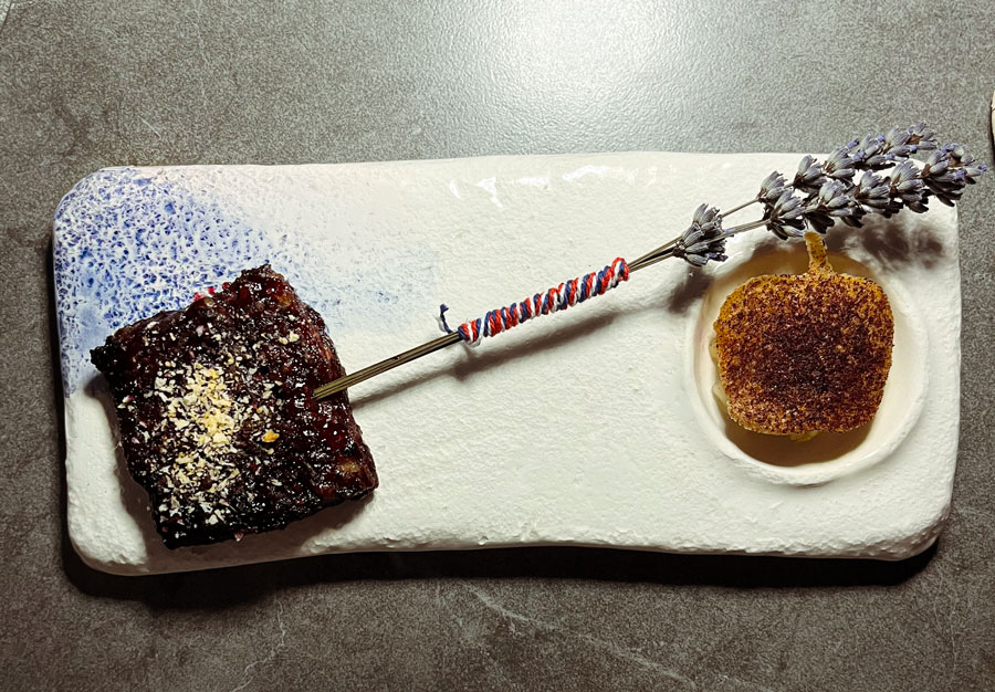 Doživljaj postupno raste s možda našim najdražim jelom dana, kamenicom s krastavcima, jednom od boljih interpretacija kamenice koje smo probali u zadnje vrijeme. Kamenica je Nnajprije je pohana, zatim položena na salatu od krastavaca i bijelog graha i prelivena emulzijom kamenica. Druga petica. Dalmatinska tradicija nastavljena je u slijedu s blitvom, krumpirima i kroketima od češnjaka sa superbogatim ribljim beurre blancom.