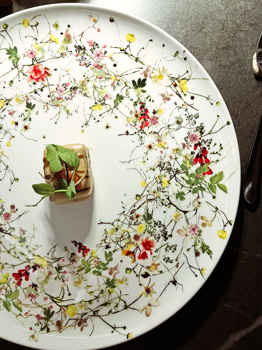 Večera za stolom započinje lagano, herbalno i uglavnom osvježavajuće morski. Veliki dio jelovnika je orijentiran na more, obalu i potragu za priobalnim okusima. Prvi zalogaji su grisini s morskim ježincem, tartlet od pastrve i ikre i soparnik s kozicama. Večera polako gradi intenzitet dalmatinskom juhom s paprikom, lukom, krastavcem i uljem vlasca u kojoj je nažalost potpuno prevladao samo krastavac, dok je slijed posvećen mrkvi mali spektakl. Na lijepom tanjuru mrkva se pomiješa sa sferom crnih maslina koje podižu jelo, dok je najbolji zalogaj coleslaw salatica položena na brioche.