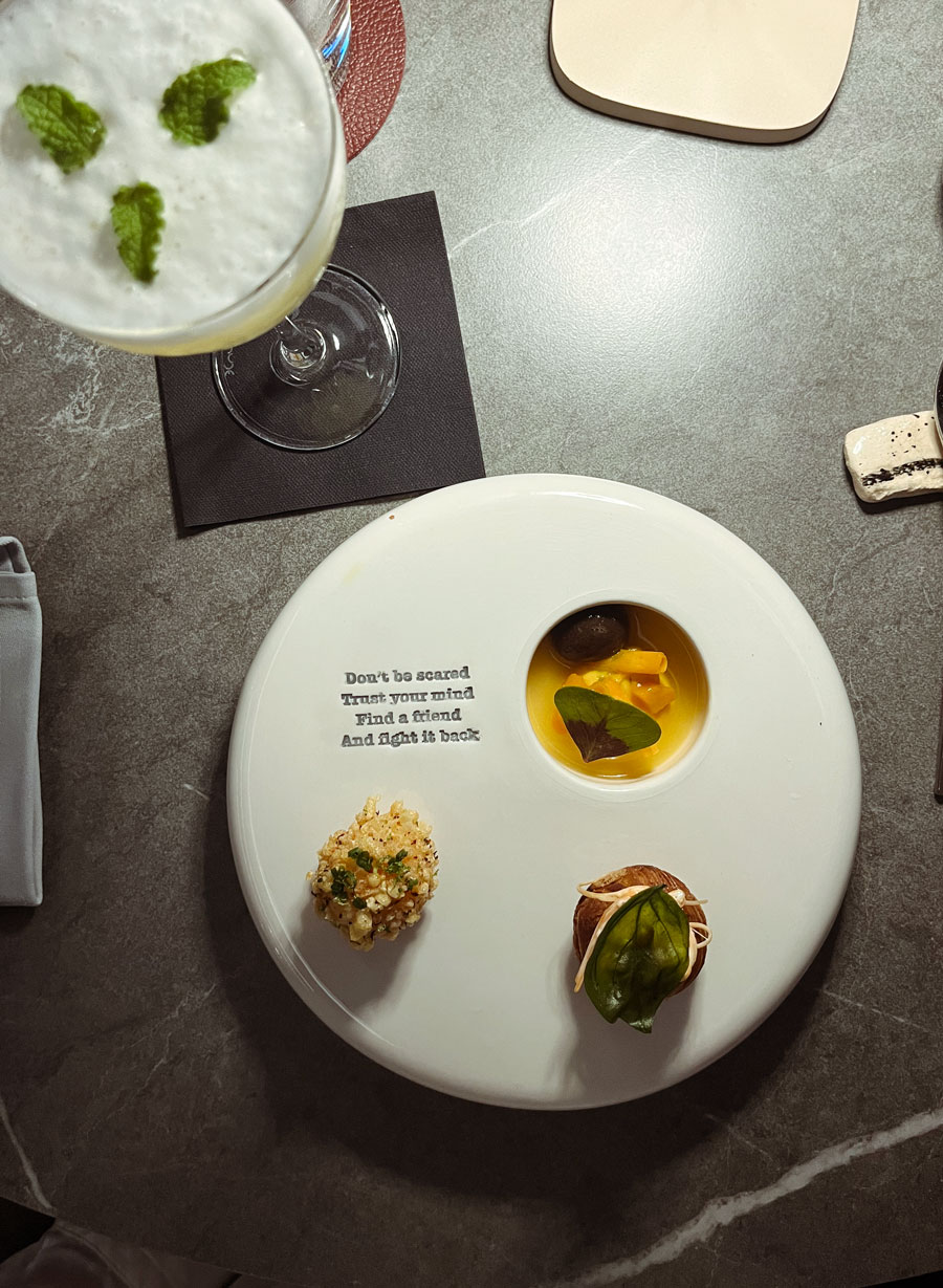 Dolazak u Noel ponajprije znači osvježenje, što je u petak navečer na zagrebačkim asfaltnim vrućim ulicama bilo prijeko potrebno. Soda koju sami prave je idealna, a kokteli Karla Ferenčaka su početak gastronomskog spektakla. Za barom poslužuje i prvi od nekoliko malih zalogaja prije službenog početka večere, uključujući izvrsni tekući istarski tartuf.