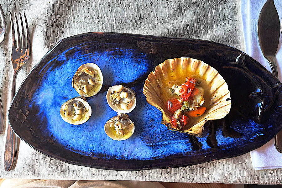 Zatim su na stol došle školjke, zajedno s ogromnom jakobovom kapicom, u bogatim, eksplozivnim uljima, skupa s pomidorom i pinjolima. Opat nam je servirao i jednu od najboljih ribljih juha u životu koja je na svojoj posebnosti dobila tako da je ikra kovača “glumila” griz. Teško može bolje od toga.