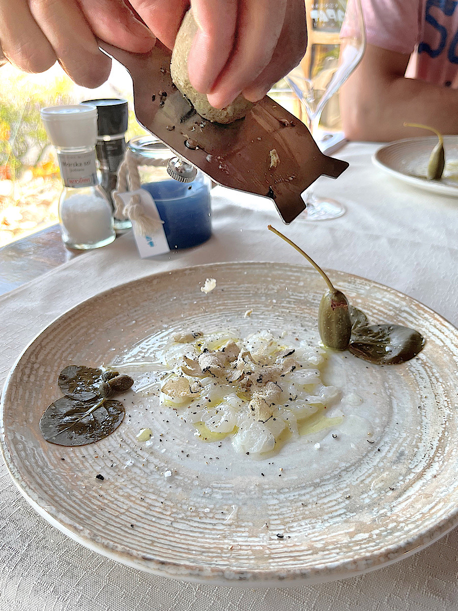 Uz školjke, Opat poslužuje i svoje maslinovo ulje, blažeg intenziteta, upravo savršeno za ribu, kao i cvijet soli s čilijem. Naravno, na otoku ne postoji obližnja pekarnica ili supermarket, pa Opat peče i svoj kruh, koji je fantastičan. Zatim na stol stiže savršeno mineralni carpaccio zubaca na koji konobari naribaju tek nekoliko listića tartufa za soft luxury osjećaj. Opatov carpaccio prilično je lako razlikovati od drugih. Njihov je najbolji koji smo probali.