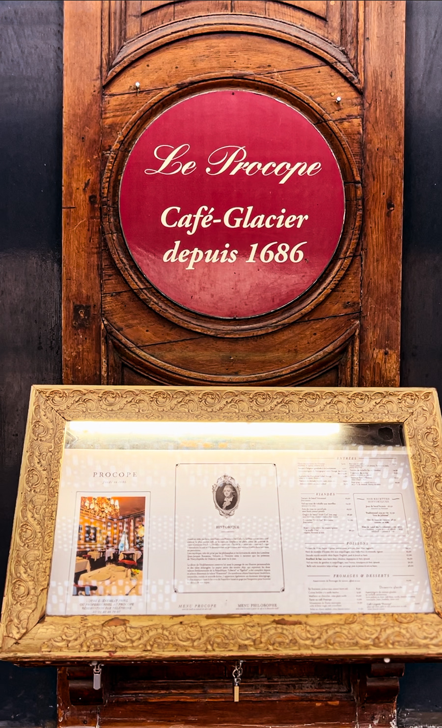 U Procopeu, koji je ime dobio po svom osnivaču Sicilijancu Procopiu dei Coltelli, svratili smo poslije briljantne izložbe Maneta i Degasa u Musée d’Orsay. Dobilo smo mali stol na terasi, odmah kraj portreta Bena Franklina i Alexisa Pirona, točno pod prozorom iza kojeg je u 19. stoljeću živio veliki francuski književni kritičar Charles Augustine Sainte-Beuve.