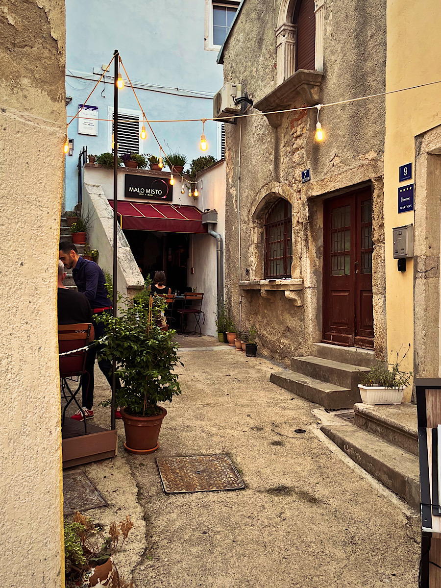 Malo Misto u gradu Krku ima jednu od boljih vinskih lista za otočke kriterije, i gotovo sva vina su na čaše. Hrana je korektna