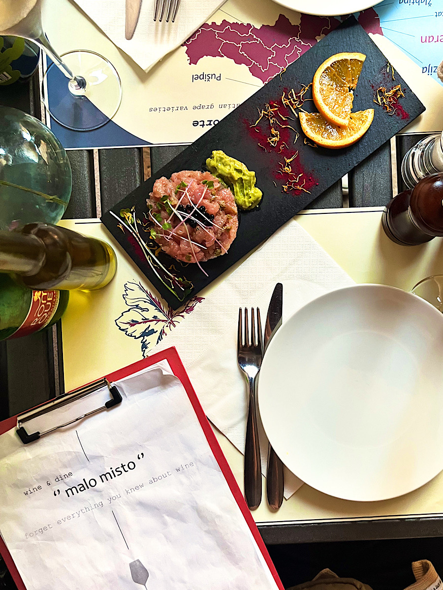Tuna tartar s početka lagane večere bio je primjeren. Malo Misto je šarmantan i pametan projekt u koji publika koju zanima vino može doći na tastinge i pojesti vrlo dobar sir. Mi smo popili dvije čaše Tomčeva pjenušca, Kunih rizling i šampione Plešivice Marany i Ab Ovo.