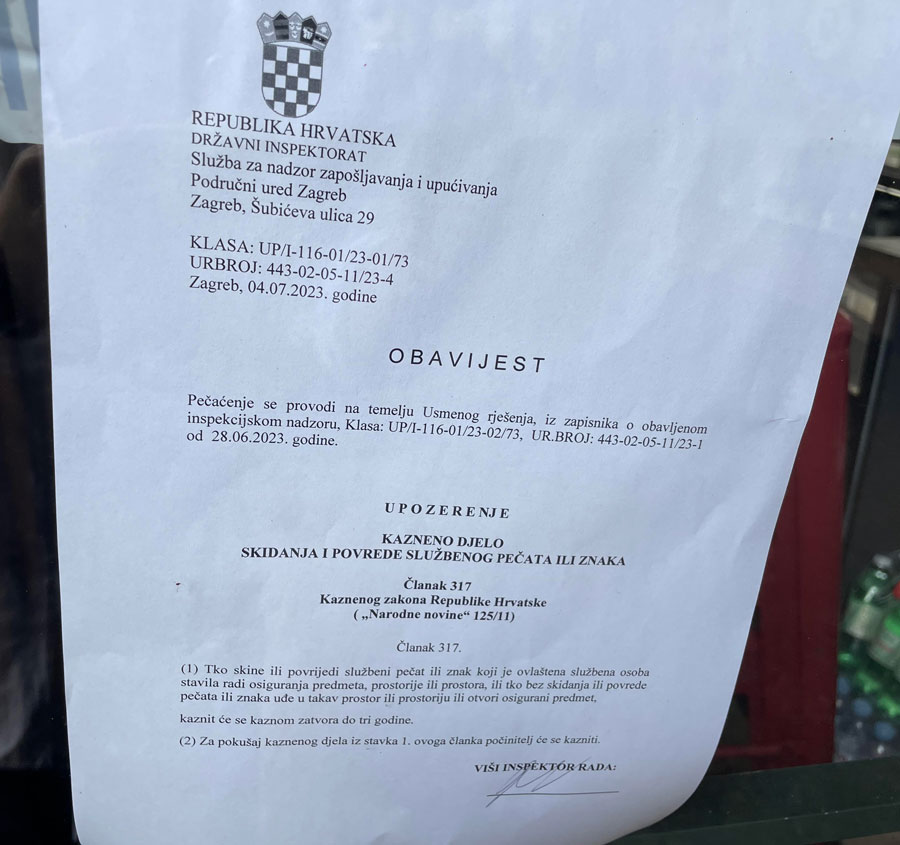Na izlozima zagrebačkog Saralee’s Thai Street Fooda na zagrebačkom Iblerovom trgu piše da je lokal na godišnjem odmoru do 4. kolovoza. Međutim, na vratima kioska ispred Galerije Importanne zalijepljen je službeni dokument slijedećeg sadržaja: “Obavijest: Pečaćenje se provodi na temelju Usmenog rješenja iz zapisnika o obavljenom inspekcijskom nadzoru, od 28. lipnja 2023. godine.”