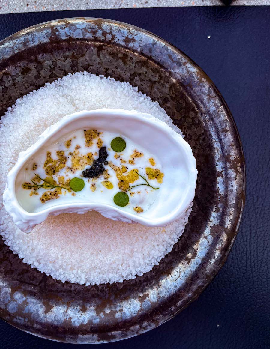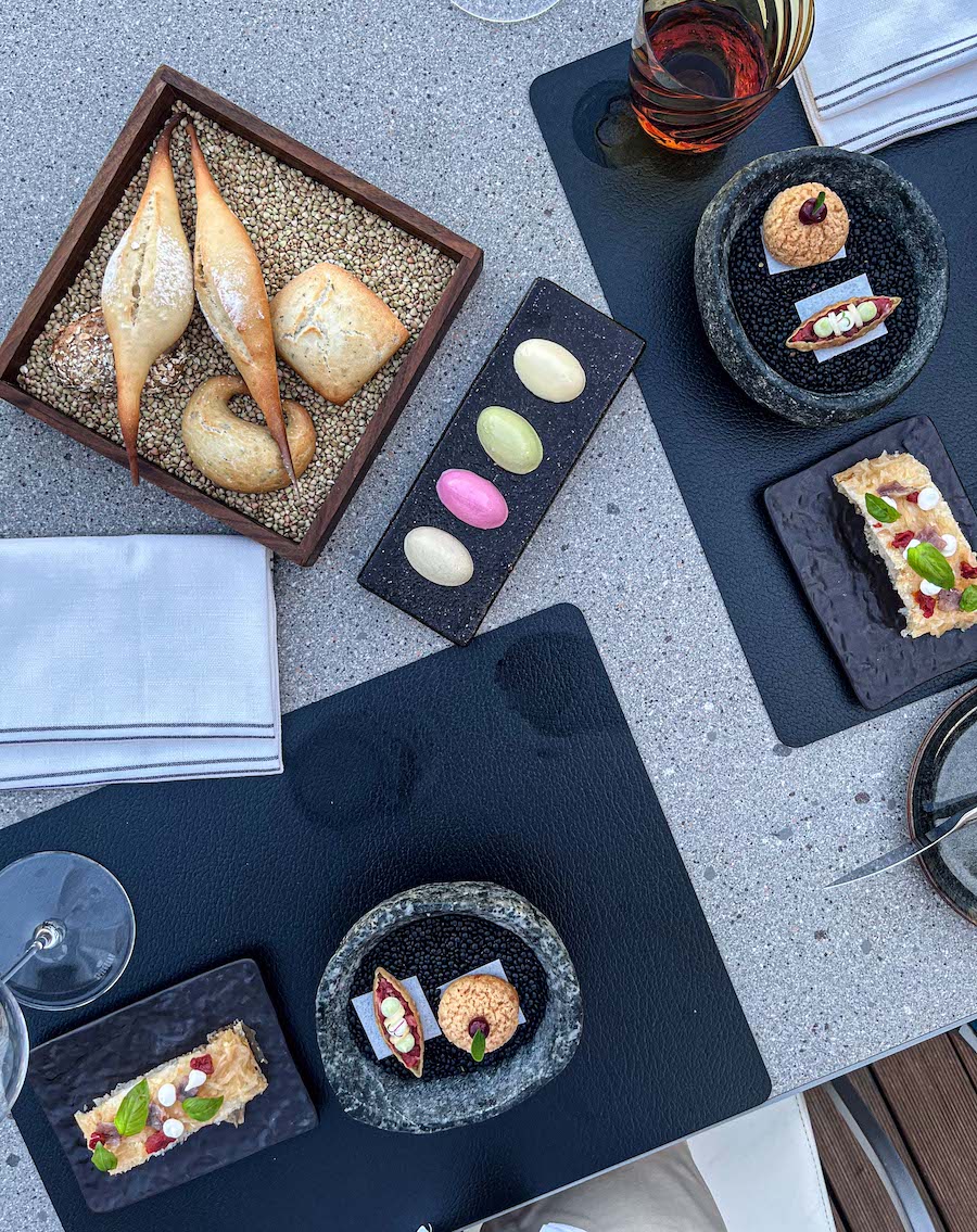 Večera započinje s nekoliko zalogajčića koji najavljuju karakter večere. Viška pogača s inćunima govori o lokalnom identitetu, goveđi tartar u krekeru dao je bogatstvo okusa, dok je foie gras u malom tijestu naznačio francusku eleganciju. Kruh koji dolazi uz amuse bouche je vrlo dobar, kao i četiri interpretacije maslaca.