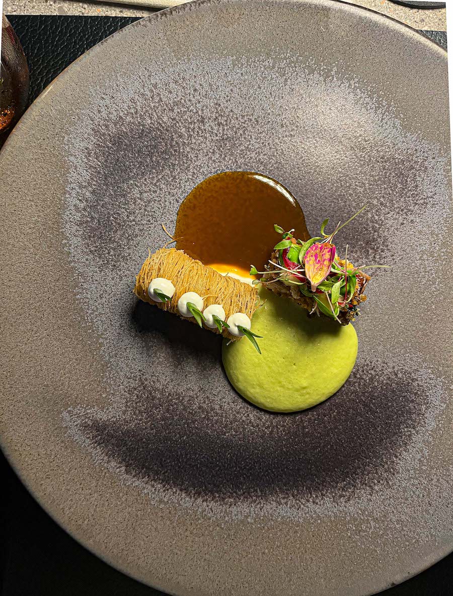 Glavno jelo je bilo i najbolje jelo večeri. Komarda, janjeći konfit od dva reza, potrbušine i lopatica, u kombinaciji s bobom, ovčjim jogurtom i janjećim jusom. Potrbušina je bila glavna zvijezda. Sočan i bogat komad mesa omotan je u kadaif i obogaćen jogurtom. Naš apsolutni favorit večeri. Lopatica janjetine je nešto masnija ali svejedno vrhunska pozicija, koju su u 360 profesionalno pripremili. Bob u formi pjenastog pirea dao je klasični akord povrtnih zelenih okusa i mente.