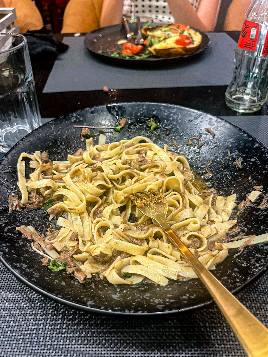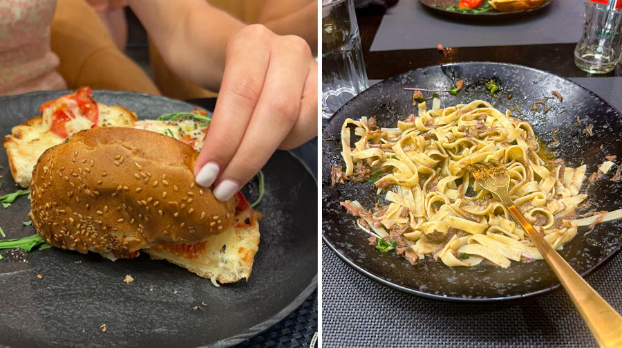 Bruschette nisu bile prepečeni kruh nego prepečene raspadnute polovice peciva za burgere: na fotografijama možete vidjeti kako je to izgledalo. Zanimljivo je da su gosti za susjednim stolom dobili propisne bruschette. Makaruni s junetinom i gljivama nisu bili makaruni; djevojke su umjesto makaruna u jelu koje se zove makaruni s junetinom i gljivama, dobili tagliatelle. Ali, zato nisu dobile gljive. U pasti s junetinom i gljivama nalazila su se doslovno tri režnja gljiva.