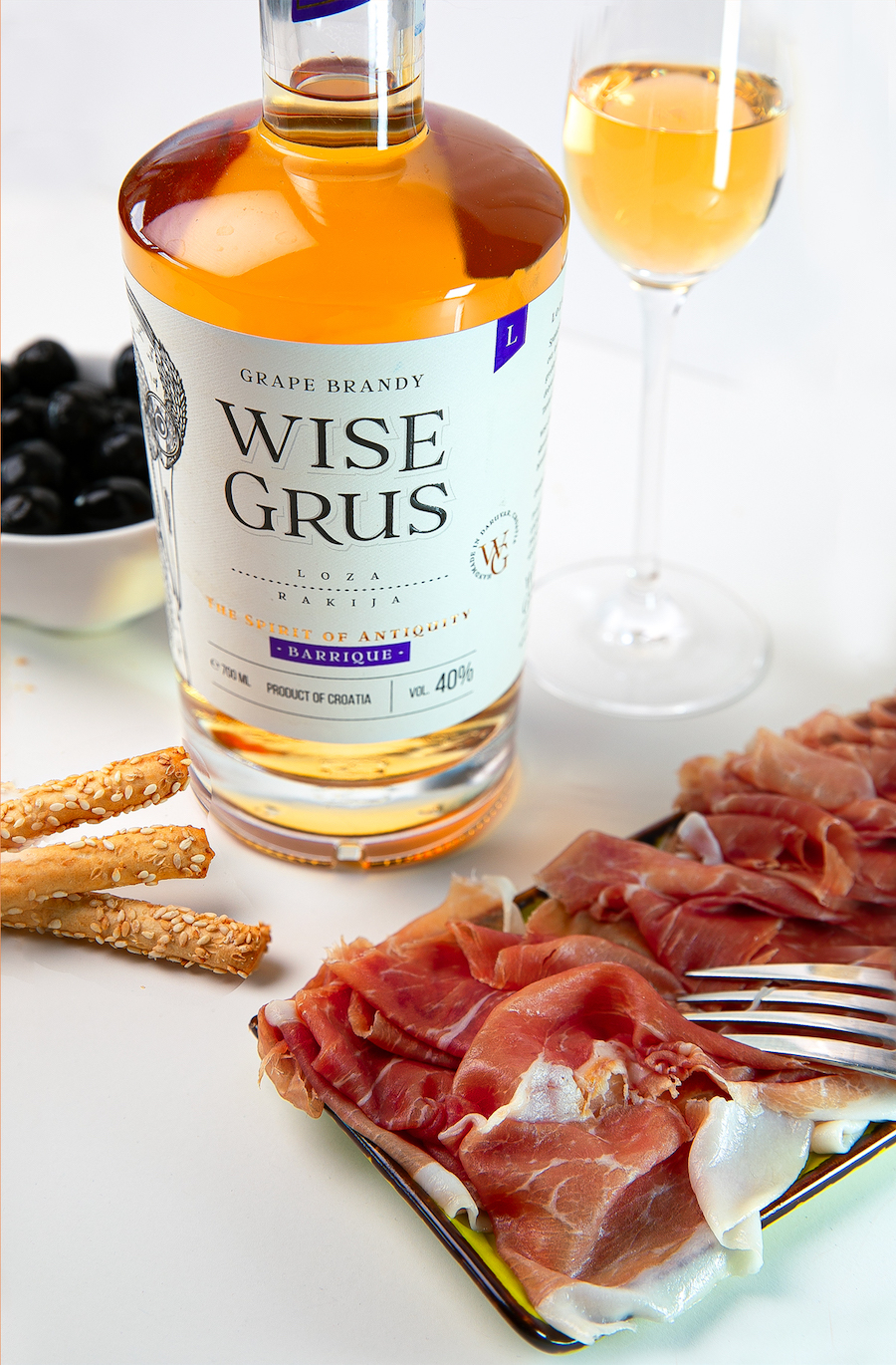 Wise Grusova šampionska Loza Barrique traži pratnju mesa s malo dima, nešto masnoće i blagom slatkoćom. Najpoznatiji žanr talijanskih pršuta zadovoljava sva tri kriterija. Moramo naglasiti kako je upravo esencijalno da se pršut reže neposredno prije posluživanja. Pršut oksidacijom dramatično mijenja okus i teksturu.