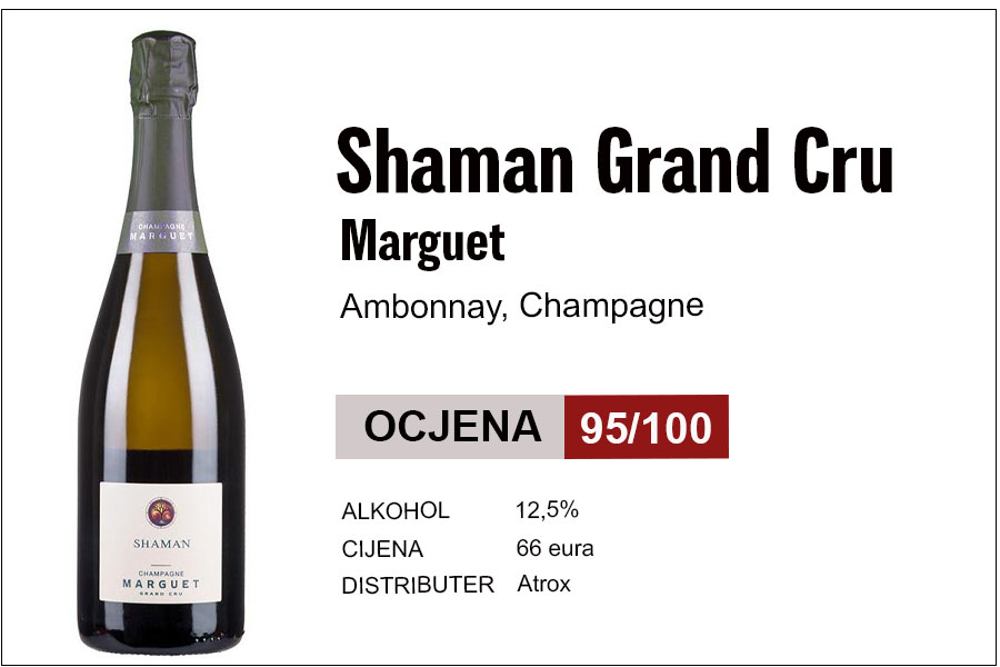 Shaman Grand Cru spada među najpoželjnije Marguetove šampanjce (premda je daleko od najskupljih). Shaman je omiljena sastavnica vinskih karti Michelinovih francuskih, skandinavskih i talijanskih restorana. Teško je reći gdje smo ga sve vidjeli, a lani ga je rovinjski Agli Amici točio na čaše kao svoj prvi, radni aperitivni šampanjac. Moramo priznati da nismo bili impresionirani. Mora da smo naletjeli na pogrešnu bocu, ili se Shaman naprosto nije slagao s malim predjelima velikog chefa Emanuelea Scarella.