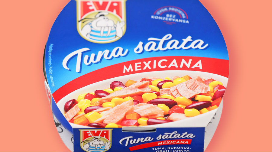 Podravka, vlasnica brenda Eva, razvija program salata s tunom već dosta godina, stalno uvodeći pojedine nove okuse, što je logično: radi se o velikom tržištu na kojem, zapravo, u Hrvatskoj osim Eve dominira još jedino čuveni talijanski brend Rio Mare. Evin je problem, međutim, u dvojbenom okusu njenih salata s tunom, barem kad je riječ o jednoj od prvih receptura iz te serije. o Salati Mexicani. Eva Salata Mexicana sastoji se od 28 posto žutoperajne tune (u nekim se deklaracijama navodi i skipjack, prugasta tuna) 19 posto ulja, dok ostatak čini povrće poput crvenog graha, mrkve, paprika i malo čilija.