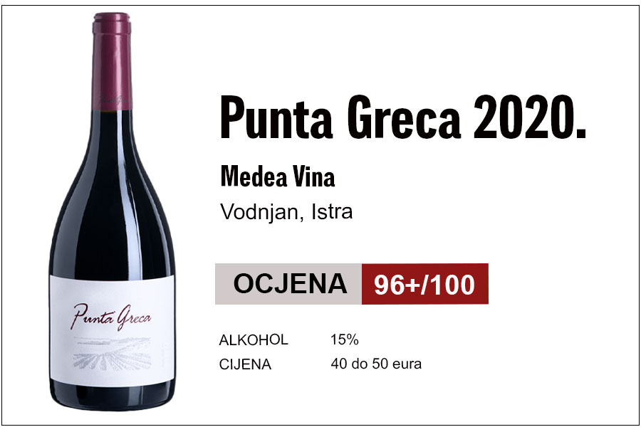 Vino je briljantno, definitivno vrijedi više od 95 bodova. Punta Greca iz 2020. godine snažno je koncentrirano, visoko alkoholno vino, s jakim aromama šljiva, Luxardo višanja, tamne čokolade s najmanje 70 posto vrlo dobrog kakaa, blagim dodirom dima i nijansama mesnog ekstrakta. Vino je na nepcu linearno s dugim okusom, naglašeno sočno, diskretno balzamično i zahtijeva ozbiljnu hranu.