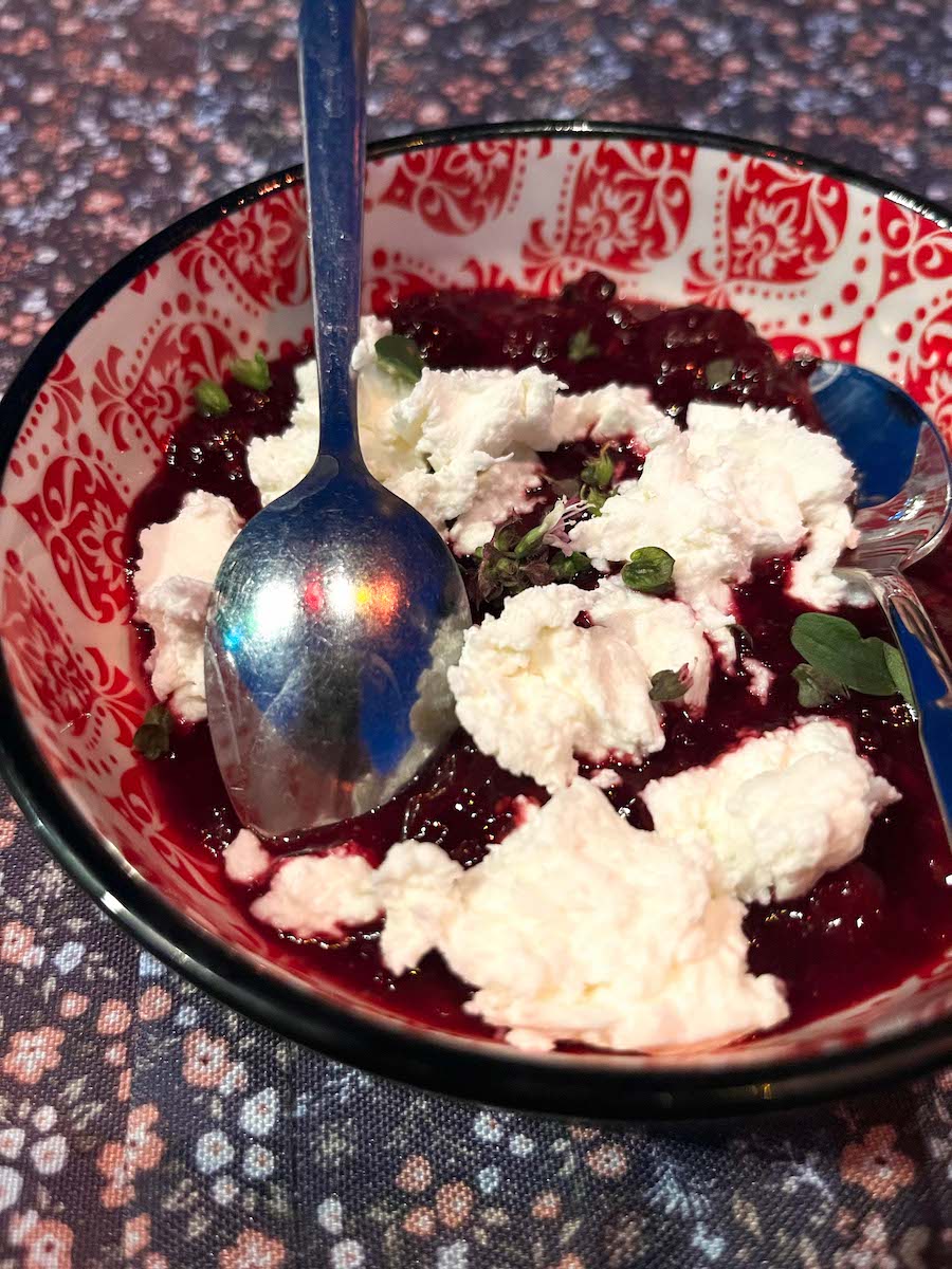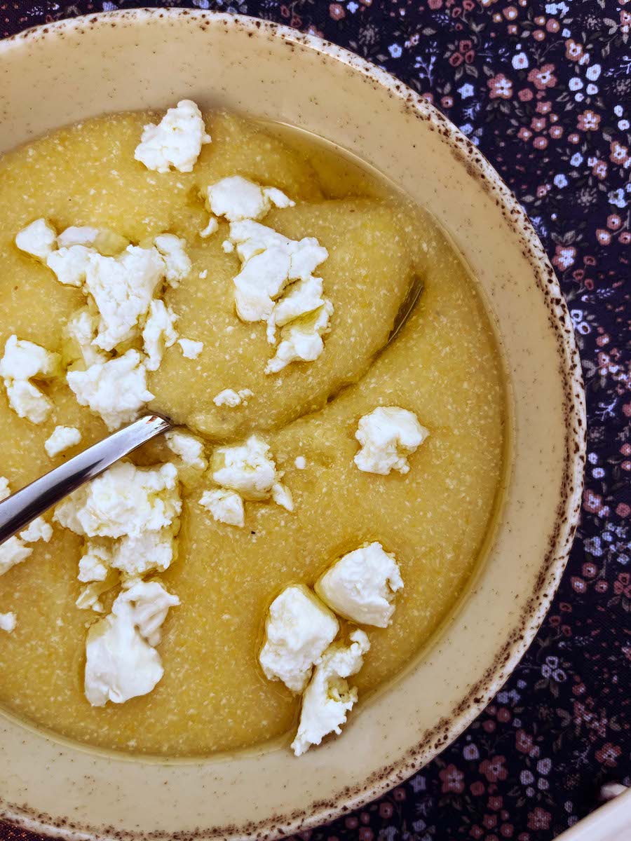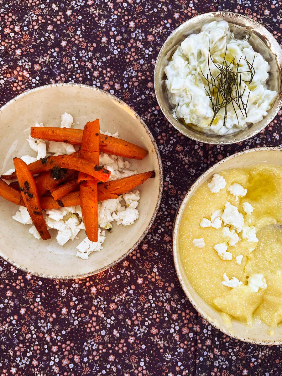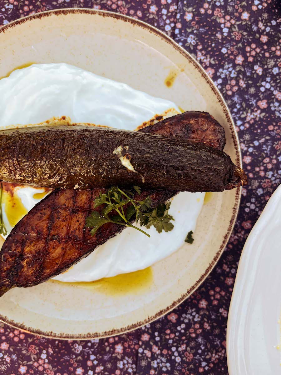 Sve počinje s domaćim kruhom, labnehom s tri elementa i sirnim namazom. Labneh, izrazito kremasta forma jogurta, genijalan je u sve tri forme, s limunom i marmeladom, medvjeđim lukom i malinama. Labneh se vraća još nekoliko puta tijekom večere, što smo dočekali s veseljem. Svojevrsna šopska salata od rajčica, luka i krastavaca obogaćena feta sirom, jedna je od boljih koje smo pojeli u zadnjih nekoliko mjeseci, dok je palenta s fetom i maslinovim uljem toliko fantastična da se nismo mogli koncentrirati ni na što drugo za stolom. U međuvremenu su stizale mrkve, patlidžan, tzatziki i glavno jelo-kozlić.