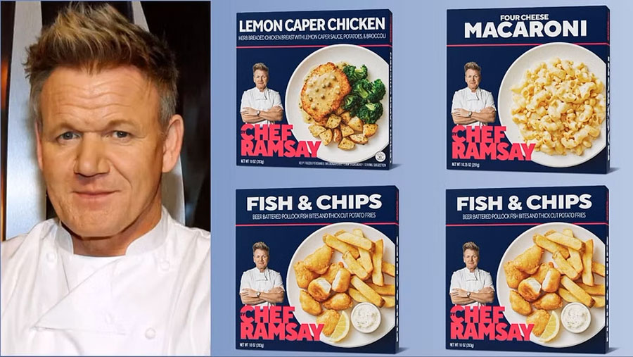 Brend By Chef Ramsay obuhvaća osam različitih jela koja će se prodavati samo u Walmartu. Među njima su pečena govedina s krumpirom, lazanje i gulaš. Za brže opcije napravio je piletinu s limunom i kaparima i prilog od pečenog krumpira i brokule i piletinu u lisnatom tijestu. Tu su i neizbježni Fish&Chips i vegetarijanska jela – rižoto od gljiva i makaroni sa sirom i mrvicama kukuruznog kruha. Ramsay kaže da je ushićen novim projektom, ali publika nije. Svaki put kad veliki slavni chef završi kao ime na kocki za juhu ili jelu za mikrovalnu, ozbiljna gastronomija doživi manji poraz a chef riskira status. Zna to i Ramsay, pa je ipak odlučio potpisati smrznuta jela, formu zbog koje je ugostiteljima vadio dušu u svojim serijalima. No, to je bilo onda a sada je Gordon Ramsay mogul.