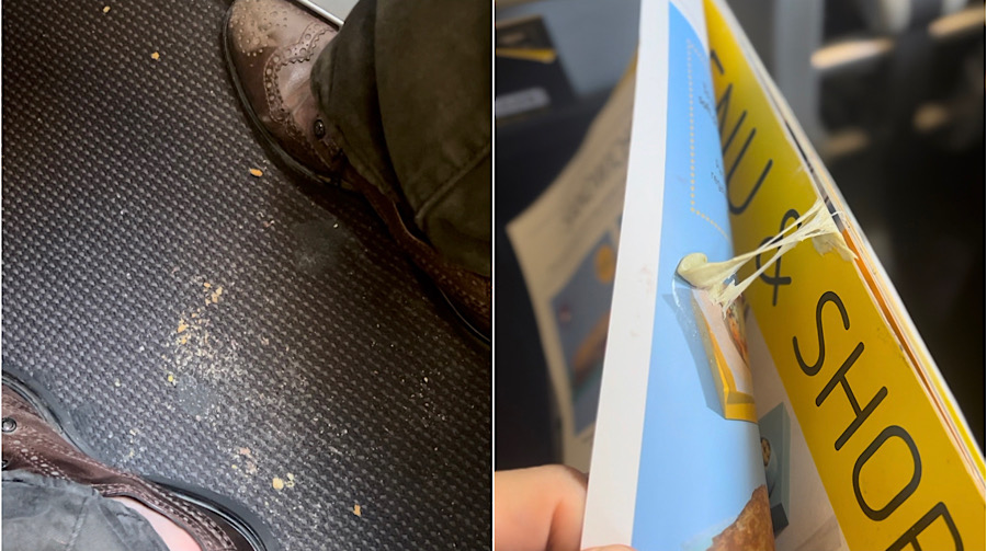 Ispod sjedala 23F skupila se hrpica ostataka nekakve krušne hrane, kao da je prethodni putnik namjerno zgnječio pizzu s Vuelingova menija ili zdrobio vrećicu čipsa. A u đžepovima dvaju sjedala u istom redu stranice inflight menija bile su zalijepljene žvakaćom gumom. Meni na susjednom sjedalu bio je pun svježih masnih mrlja.