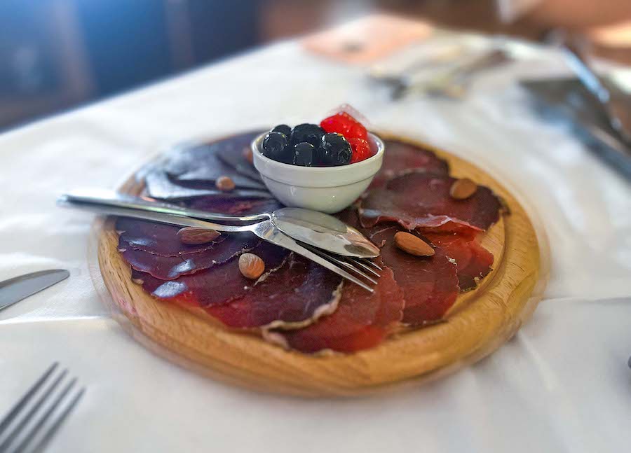 Naručili smo pršut od jelena, distinktivnog moćnog okusa koji je bio čak i premoćan za početak. Pa smo za glavno jelo uzeli teletinu pod pekom za koju su nam rekli da je u dnevnoj ponudi i gulaš od medvjeda. Teletina pod pekom definitivno je slabije jelo, s tek nekoliko dobrih strana. Meso je meko ali serviraju ga suho, bez ikakvog umaka, toća ili nečega što bi dodalo sočnost, već s nekakvom amaterskom zgusnutom zaprškom za koju stvarno ne znamo što bi trebala predstavljati. Krumpir koji je inače domaći i vrlo dobar, nije proveo ni trenutka s teletinom već je pržen u fritezi i na stol je došao premastan. Zaista šteta, ali ta se greška lako može ispraviti.