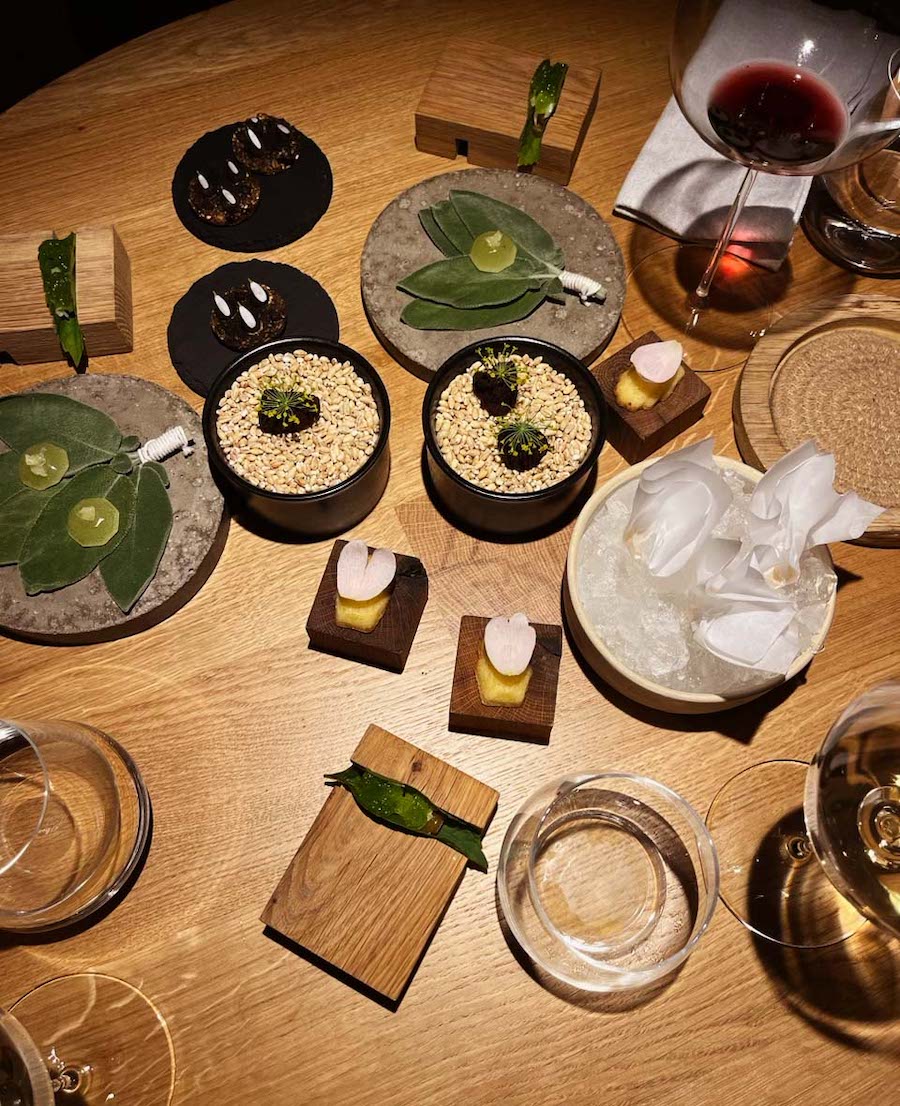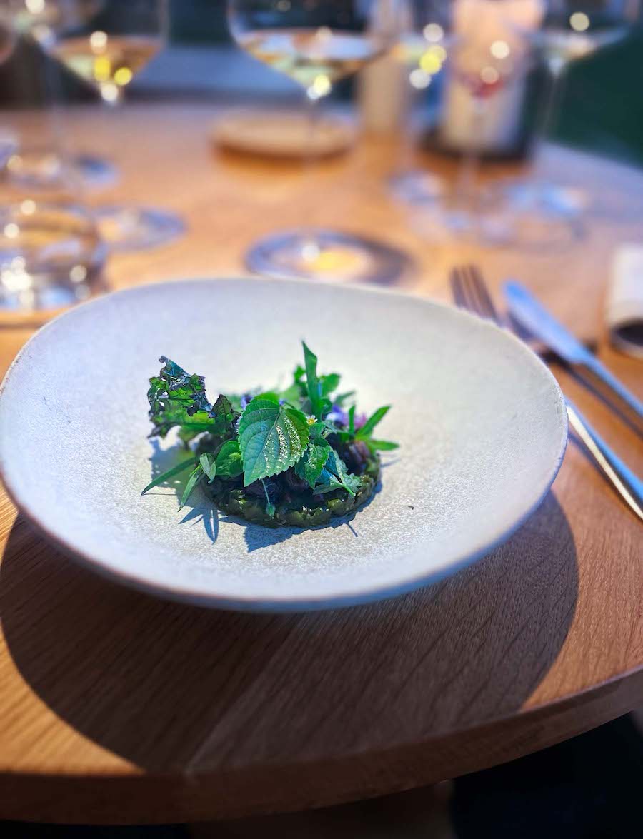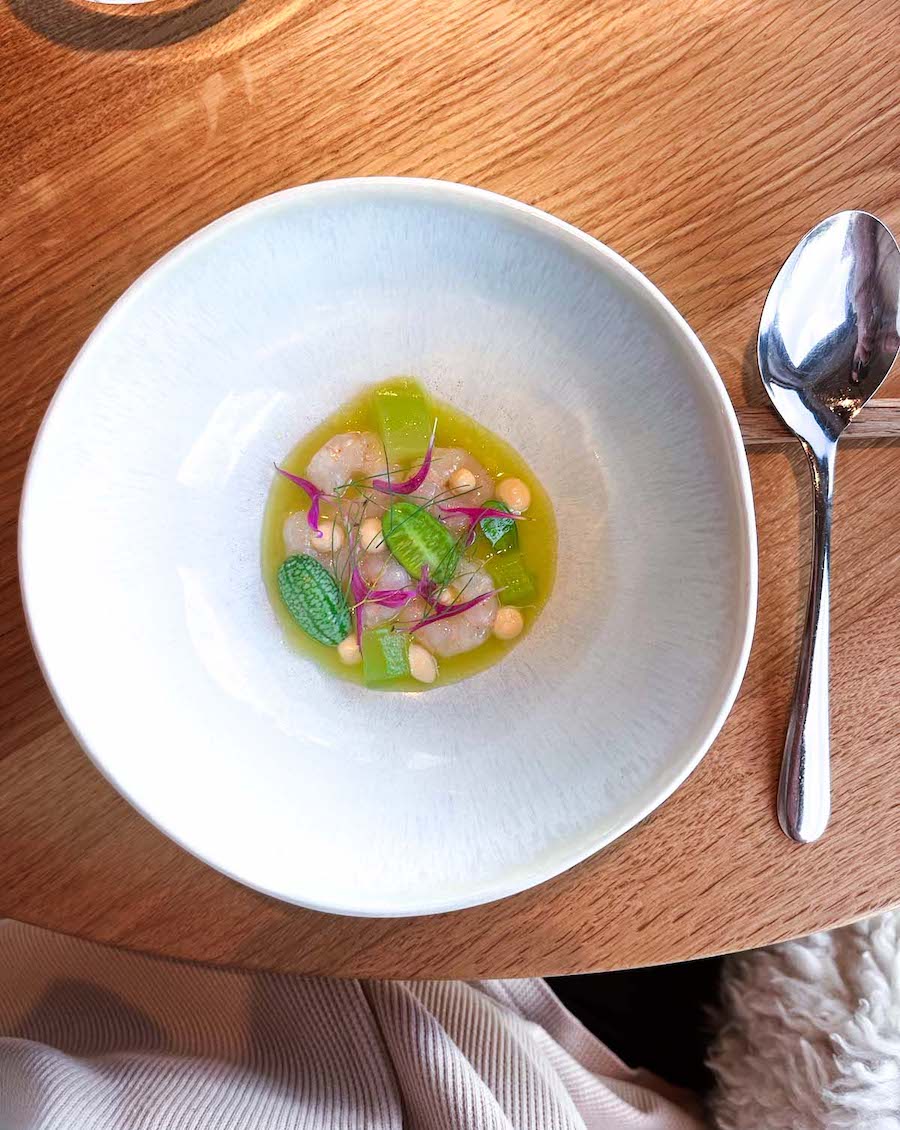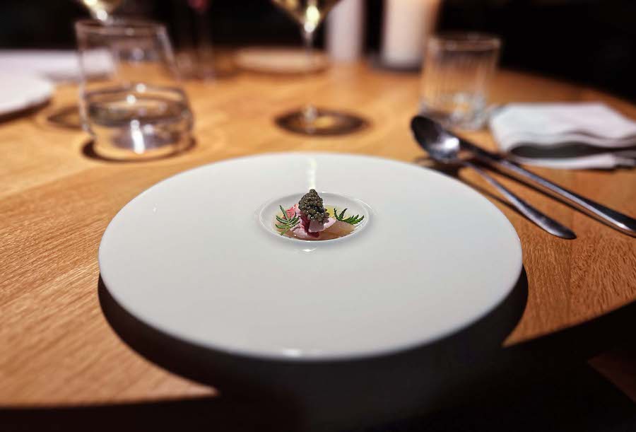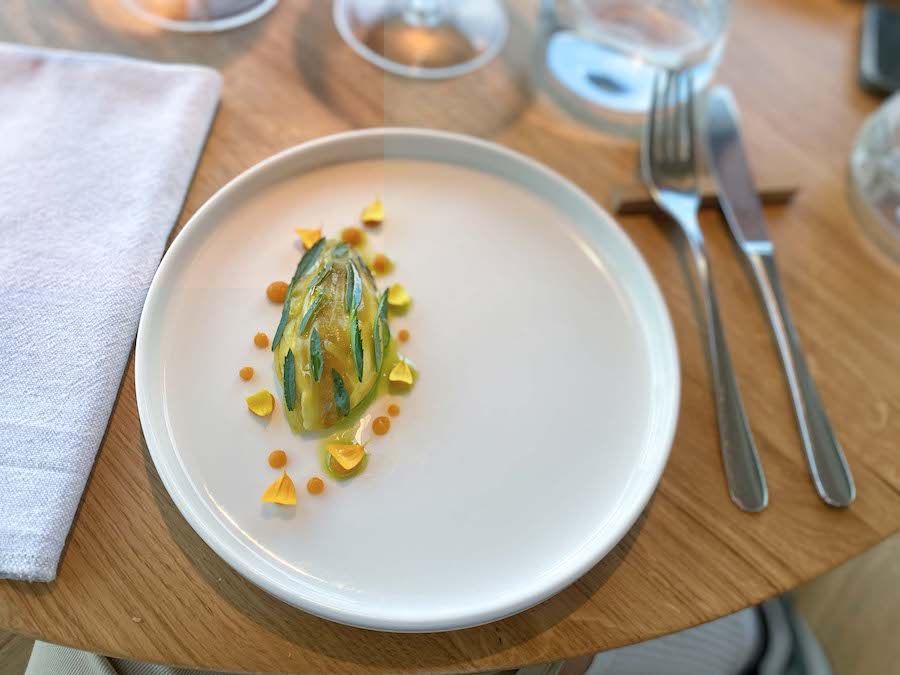 Pa smo već za pozdrave iz kuhinje dobili jela koja su bolja i zanimljivija nego cjelokupne večere u nekim restoranima. Mali zalogaji patlidžana s lješnjakom i crnim tartufima uz fritulice punjene kukuruzom ostavili su posebno snažan dojam, dok su gljive i pjena od kvasca i krafnice s dagnjama uspješno držale korak s našim favoritima. Slijedio je red laganih jela intenzivnih okusa, koje postupno uvode goste u večeru. Jadranske kozice s malim krastavcima i majonezom ježinaca idealno su ljetno jelo, dok mladi kozji sir omotan u papriku gotovo duhovito imitira popularna ljetna jela s ovih prostora.