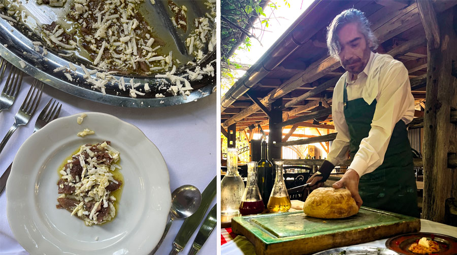 Goveđi jezik premazan maslinovim uljem, kozjim sirom i velikom dozom češnjaka doslovno pokazuje Žagarov rukopis. Radi se o intenzivnom, moćnom jelu koje jednostavno ne možete prestati jesti. Zatim na stol stiže kruh još vreo iz krušne peći, jedna od najboljih koje smo pojeli u životu, s božanstvenom hrskavom koricom i mekom, gustom sredinom. Uz goveđi jezik dobili smo i sirne namaze, od kojih nas se posebno dojmio ekstremno ljuti s papričicama.
