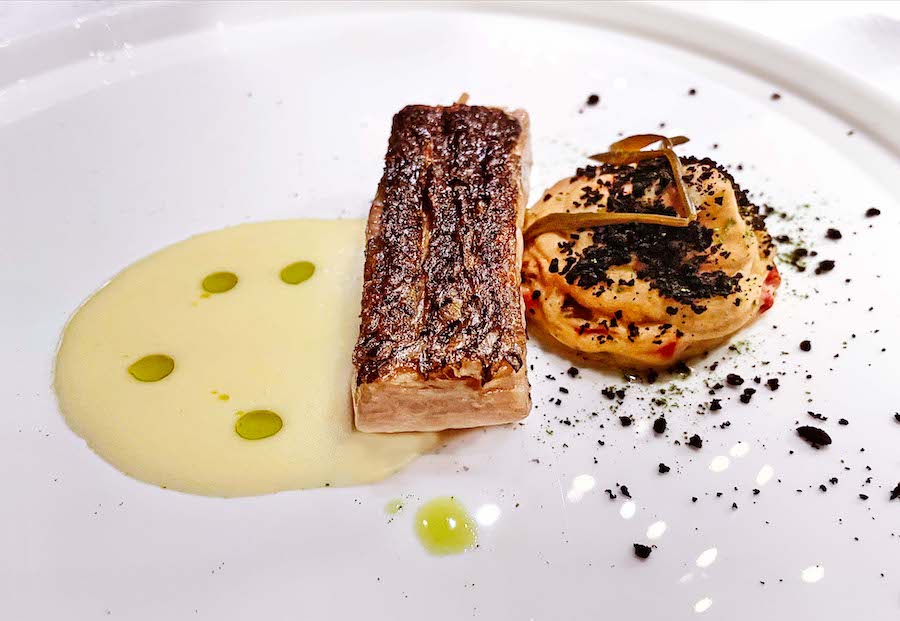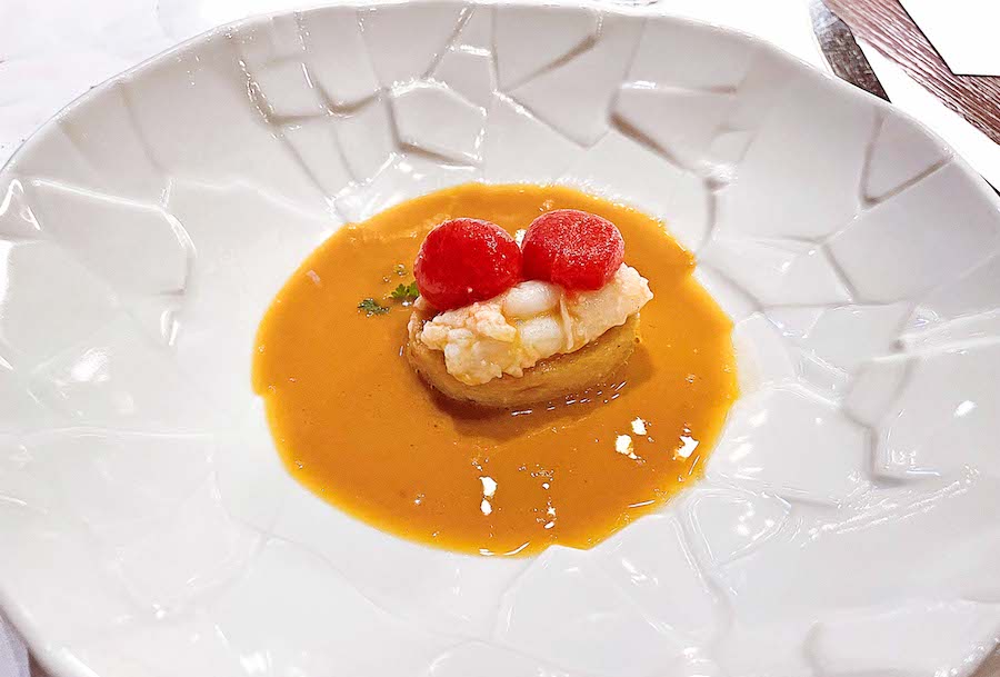 Ideju škampa na istarskoj skuti, izvrsnog tanjura velikog Zdravka Tomšića iz kastavskog restorana Kukuriku i poslije iz Drage di Lovrana, chef Luka Goleš modificirao je u škampe na bijeloj palenti s kozjim sirom, biskom od škampa i žutih rajčica i ukiseljenim žutim rajčicama. Sommelier je uz ovu kvarnersku kombinaciju točio  Kosovčev Škrlet iz 2018. Odličan primjer pojma mare e monti.