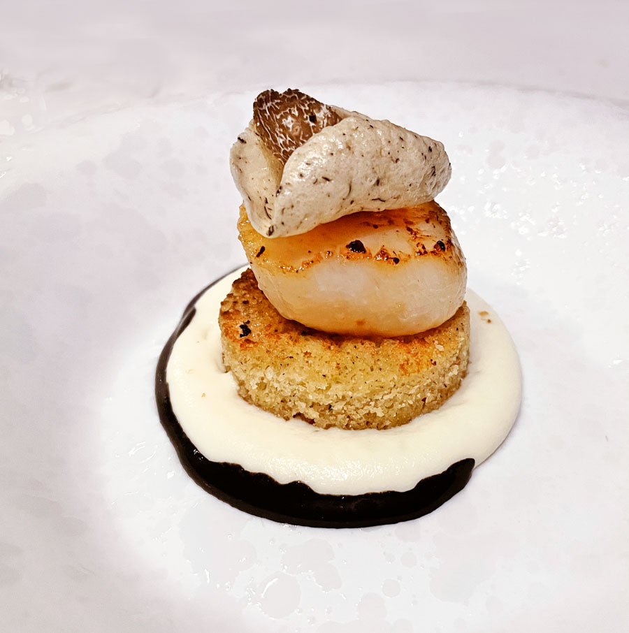 Uz treći slijed, kojeg su činili pjena od cvjetače i tartufa, jakovske kapice, čips i gel od tartufa s briocheom sa tartufom, serviran je Bastianichev Bijeli pinot iz 2021. Cvjetača i jakovska kapica  svojim su slatkim notama dobro uranotežile oporost i snagu tartufa.