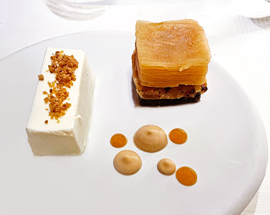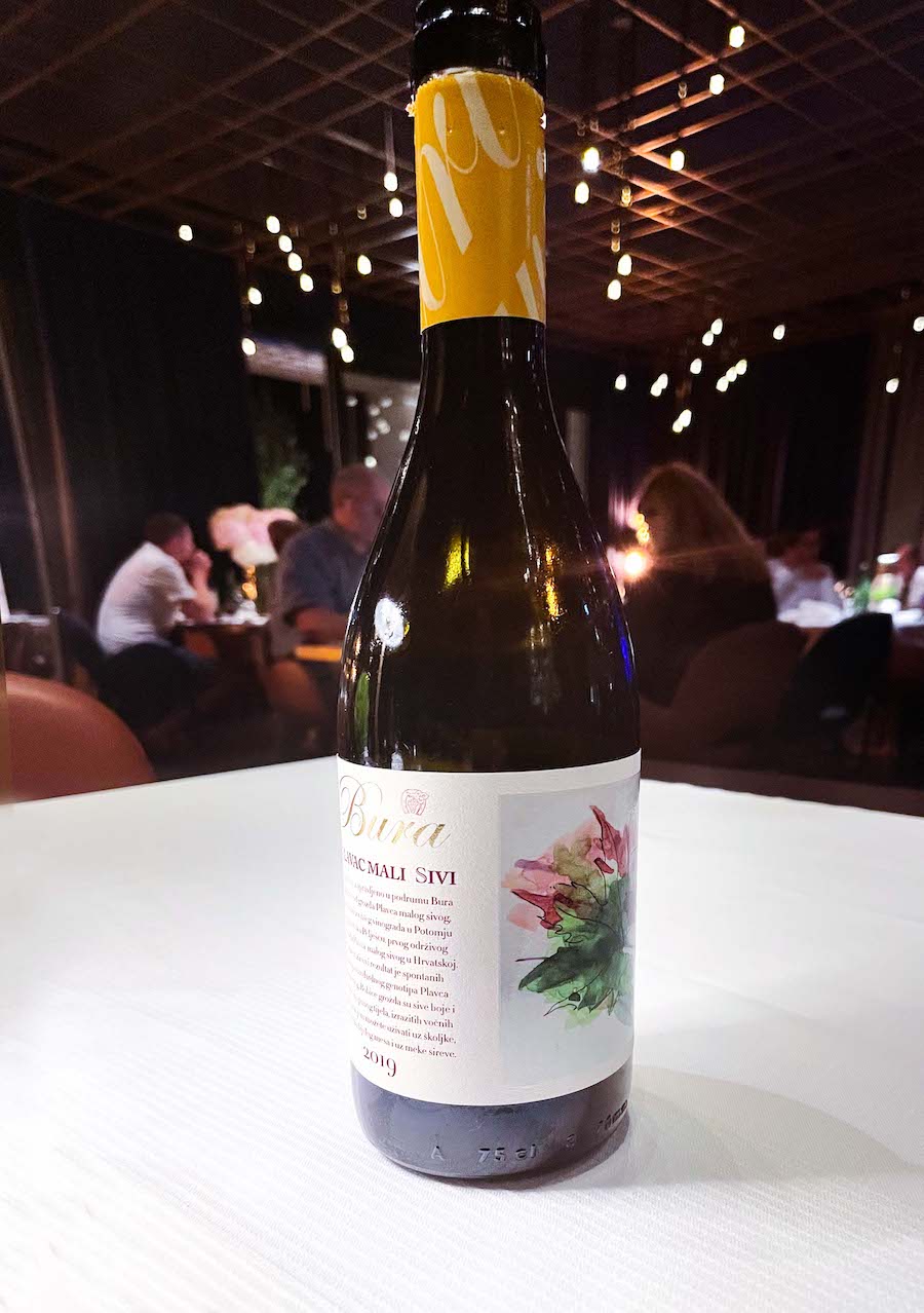 Precizno pečeni file odležane hame lijepo se složio s kremom od slanutka obogaćenom crnim maslinama, paprikom,ukiseljenim motrom i prahom od lovora. Beurre blanc s mirinom bio je sam po sebi izvrstan, premda možda nepotreban. Plavac Mali Sivi vinarije Bura iz 2019. vrlo dobro je pratio ribu, unatoč dosta izraženim taninima koji su u pojedinim trenucima prekrivali okus hrane. Prekmurska gibanica poslužena na kraju večere može biti vrlo težak desert poslije pet sljedova.
