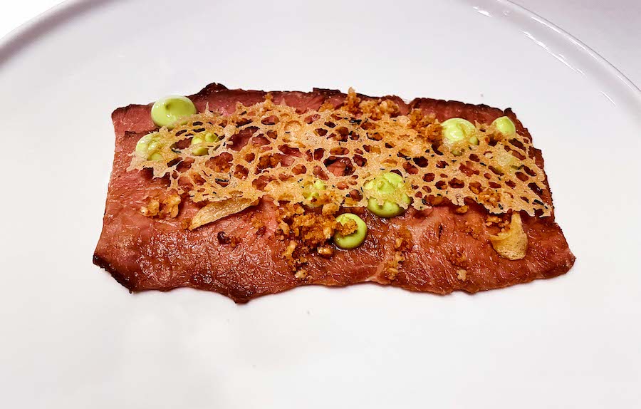 Prvi slijed, tartar biftek s prepeličjim jajem uz dva maslaca, s inćunima i suhim rajčicama i s peršinom i konjakom, uz topli mini baguette bili su odličan uvod popraćen španjolskim pjenušcem Raventos Blanc de blancs. Maslac s inćunima i sušenom rajčicom bio je bolji pratilac izvrsnom tartaru. Glavna zvijezda večeri bio je roast beef mariniran u ponzu umaku s crumbleom i čipsom od lješnjaka i majonezom od rukole. Ponzu umak učinio je izvrsno pečeni roast beef svježim, ljetnim, a istovremeno karakternim i snažnim. Odličan dojam zaokružio je rose Rusula Rizman iz 2022, koji se izborio za svoju ulogu kraj kiseline ponzua i pikantne masnoće od rukole.