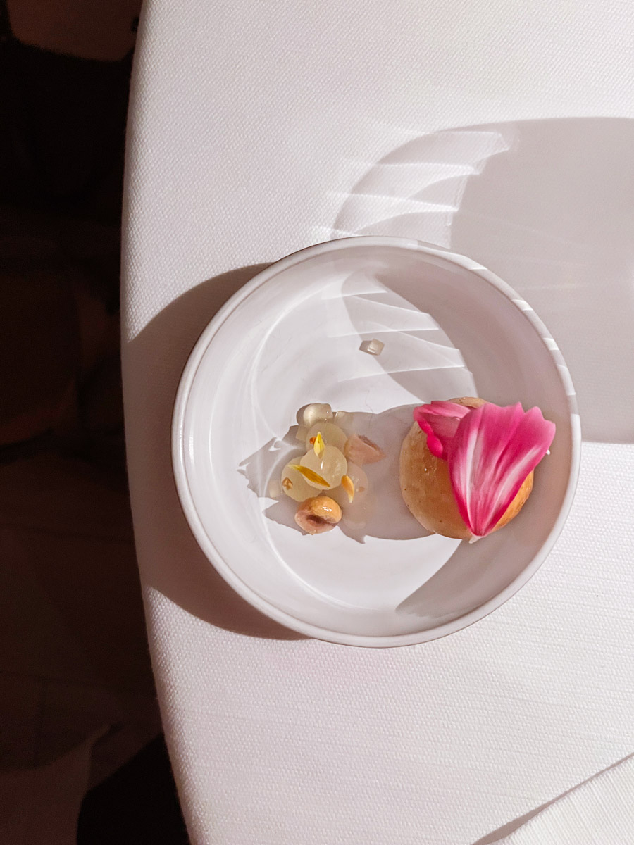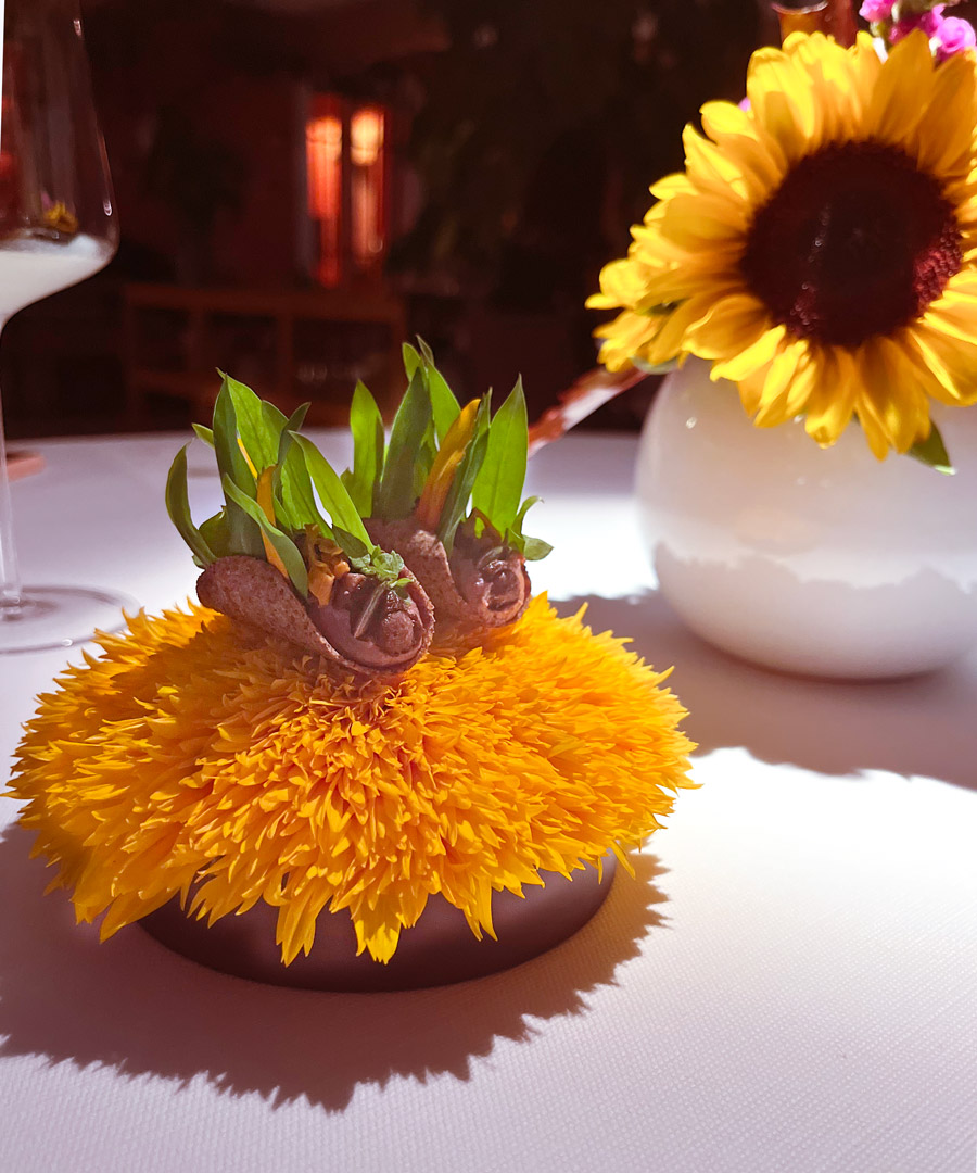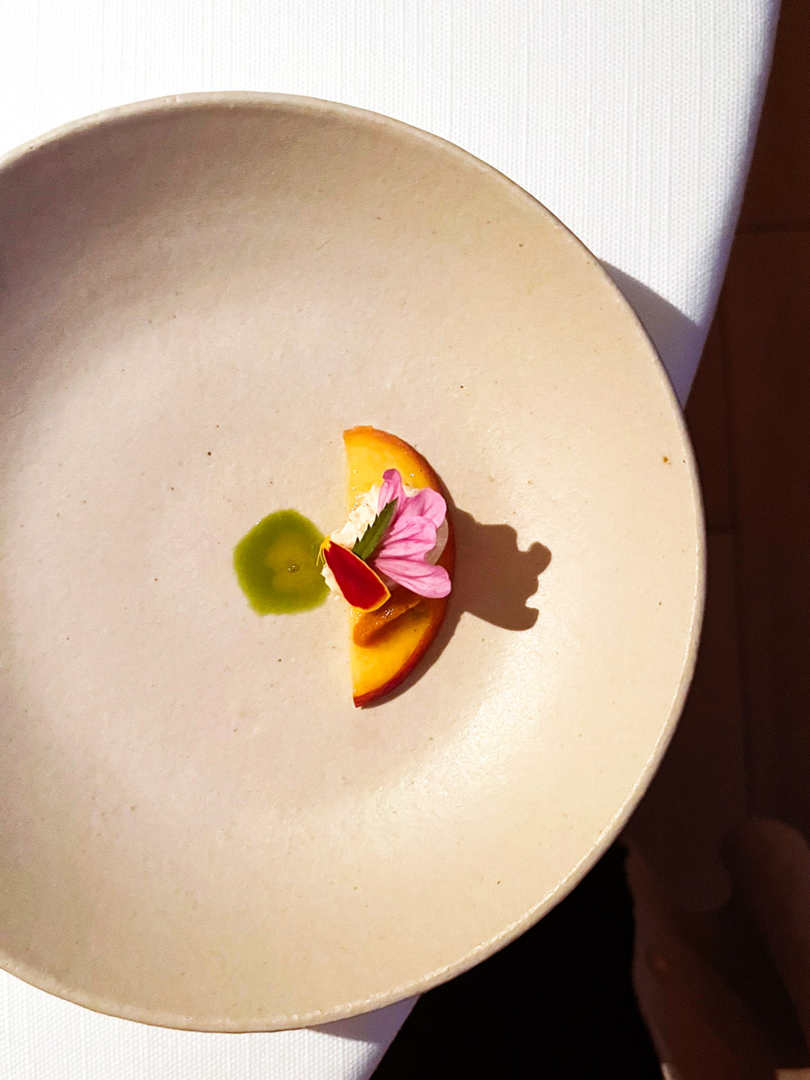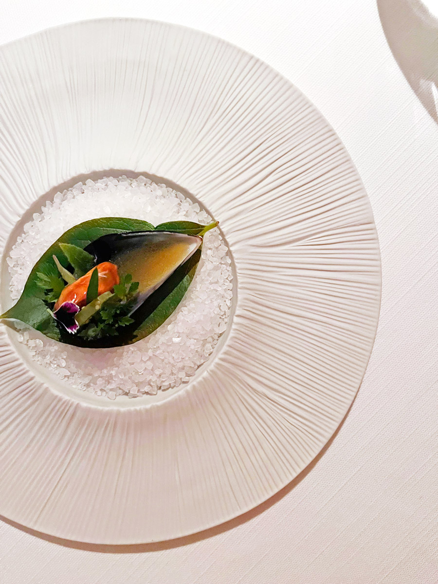 Naša večera 20. rujna, počela je lagano, ali okusima briljatno, s malim zalogajima breskve, tacosa i dagnji. Breskva, zajedno s bademima i cvijetom nevena, katapultira vas na putovanje za nekoliko sekundi, a tacosi vas održavaju blizu zemlje. Dagnje u kombinaciji s laktofermentiranom vodom rajčica i čilijem doista kompleksno i intenzivno zaključuju prvi dio večeri.