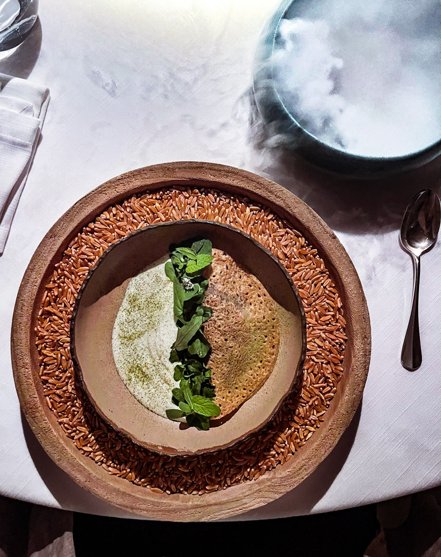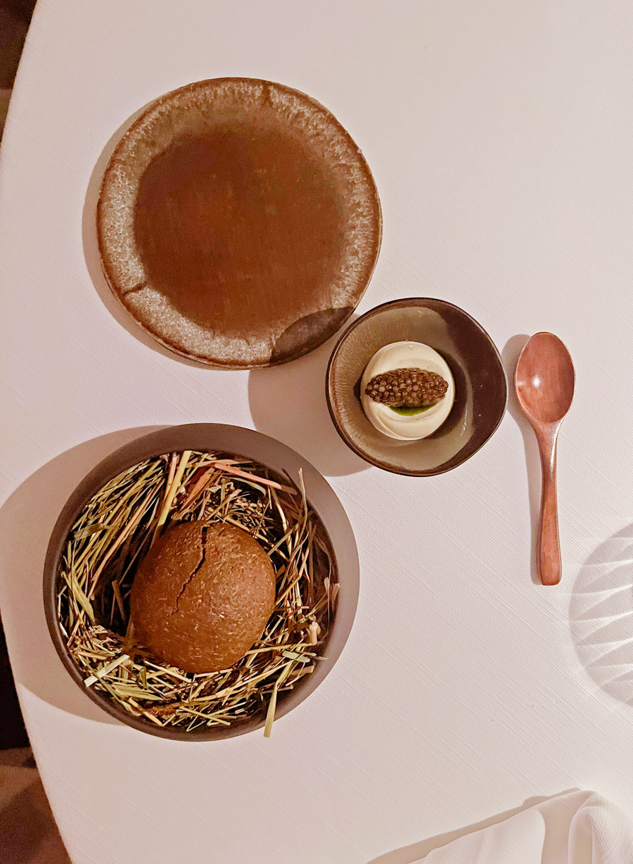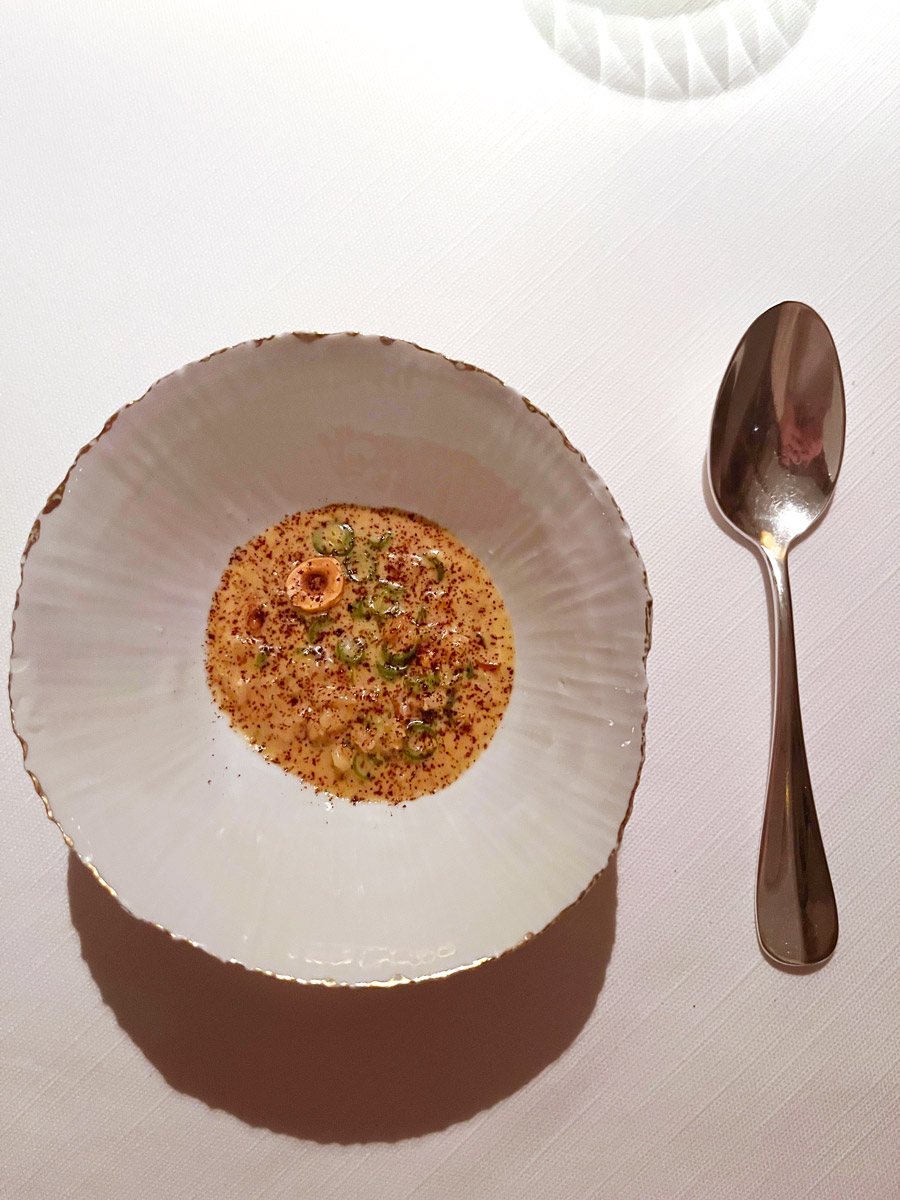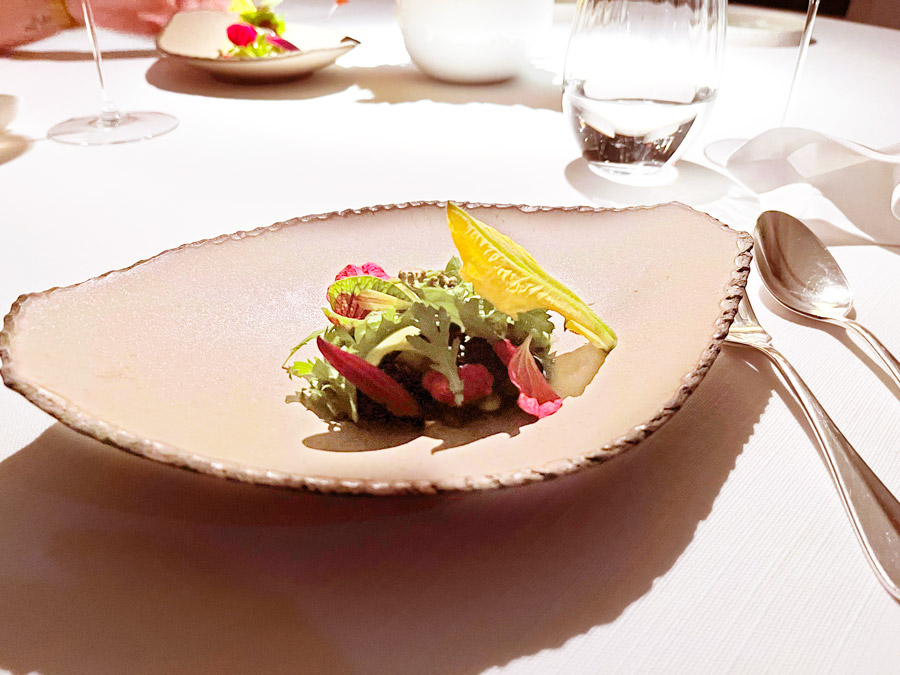 Naša večera 20. rujna, počela je lagano, ali okusima briljatno, s malim zalogajima breskve, tacosa i dagnji. Breskva, zajedno s bademima i cvijetom nevena, katapultira vas na putovanje za nekoliko sekundi, a tacosi vas održavaju blizu zemlje. Dagnje u kombinaciji s laktofermentiranom vodom rajčica i čilijem doista kompleksno i intenzivno zaključuju prvi dio večeri.