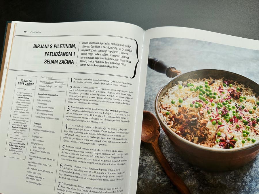 Knjiga donosi i desetak recepata kroz čiju pripremu se može učiti i shvaćati logika korištenja začina s različitim namirnicama. Jedan od atraktivniijh elemenata ove knjige svakako su Periodički sustav začina i tablica začina i njihovih aromatskih spojeva.