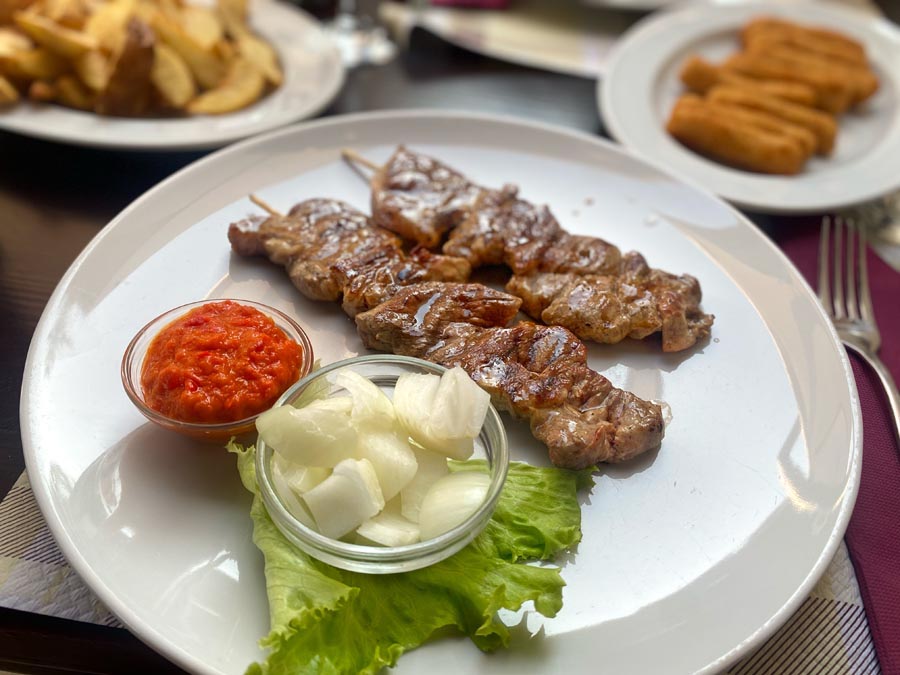 Kad smo stigli, gotovo svi stolovi u lokalu su bili rezervirani. Pa smo s velikog jelovnika  nakrcanog nepotrebnim jelima naručili ćevape i ražnjiće, čisto da probamo i kakvo je ostalo meso s grila. Prvo su nas iznenadili kruhom koji sami peku, i serviraju na maloj drvenoj daskici. Kad bi još došao na stol topao, ovaj prilično dobar kruh mogao bi se posluživati i u boljim restoranima. Na Sušaku ima bar neki izbor krumpira, mladi i pomfrit, što je uvijek pohvalno.