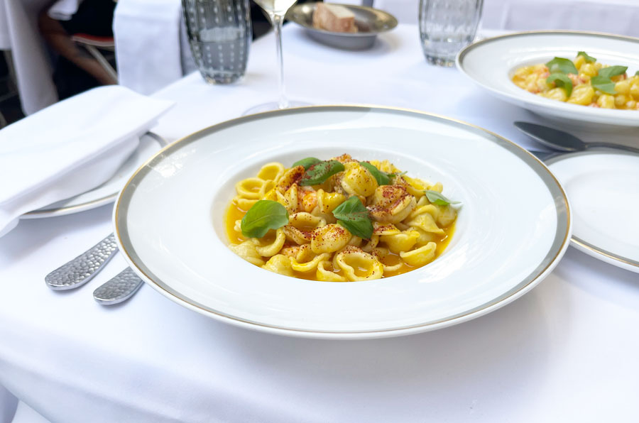 Langosteria također ima vrlo zanimljivu vinsku kartu i toči Ruinart na čaše. Za predjelo poslužuju neodoljivi topli kruh. Naručili jednostavnih jela. Frittura Langosteria je u dijelu menija s potpisnim jelima i fantastičan je snack od prženih crvenih gambera, škampa i lignji koje je odlično pratio Ruinart. Njoki s gamberima bili su jedno od elegantnijih i preciznije kuhanih comfort food jela koje smo probali u zadnjih mjesec dana, dok su orecchiette s plodovima mora pune laganih ali briljantno fokusiranih okusa. Visoku razinu održao je i fantastični creme brulee koji smo naručili za kraj.