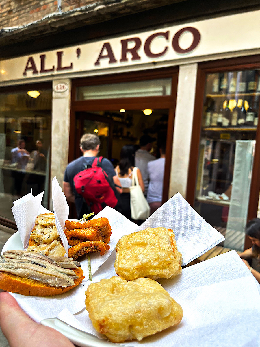 Simpatični i ekstremno popularni mali bar radi samo od 10 ujutro do 14:30, pa je navala ogromna. All’ Arco nudi nekoliko malih zalogaja od ribe, bakalara bianco ili sira. Mi smo uzeli prženu mozzarellu punjenu inćunima koja je bila senzacionalna, pržene inćune, lignje s rižom i povrćem, bakalar bianco, te sasvim male, ali fantastične inćune uz dvije čaše Lugane.