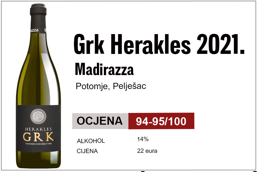 Herakles iz 2021. ujedinjuje raskošnu teksturu, veliko tijelo i visoku kiselinu. Vino je donekle diskretno školovano u hrastu i prepuno herbalno cvjetnih aroma. Kad smo ga prvi put probali u srpnju 2022. godine u podrumu obitelji Madirazza, podsjetio nas je, zbog kombinacije mirisa bijelog cvijeća i mediteranskih trava, na vrhunski Soave.
